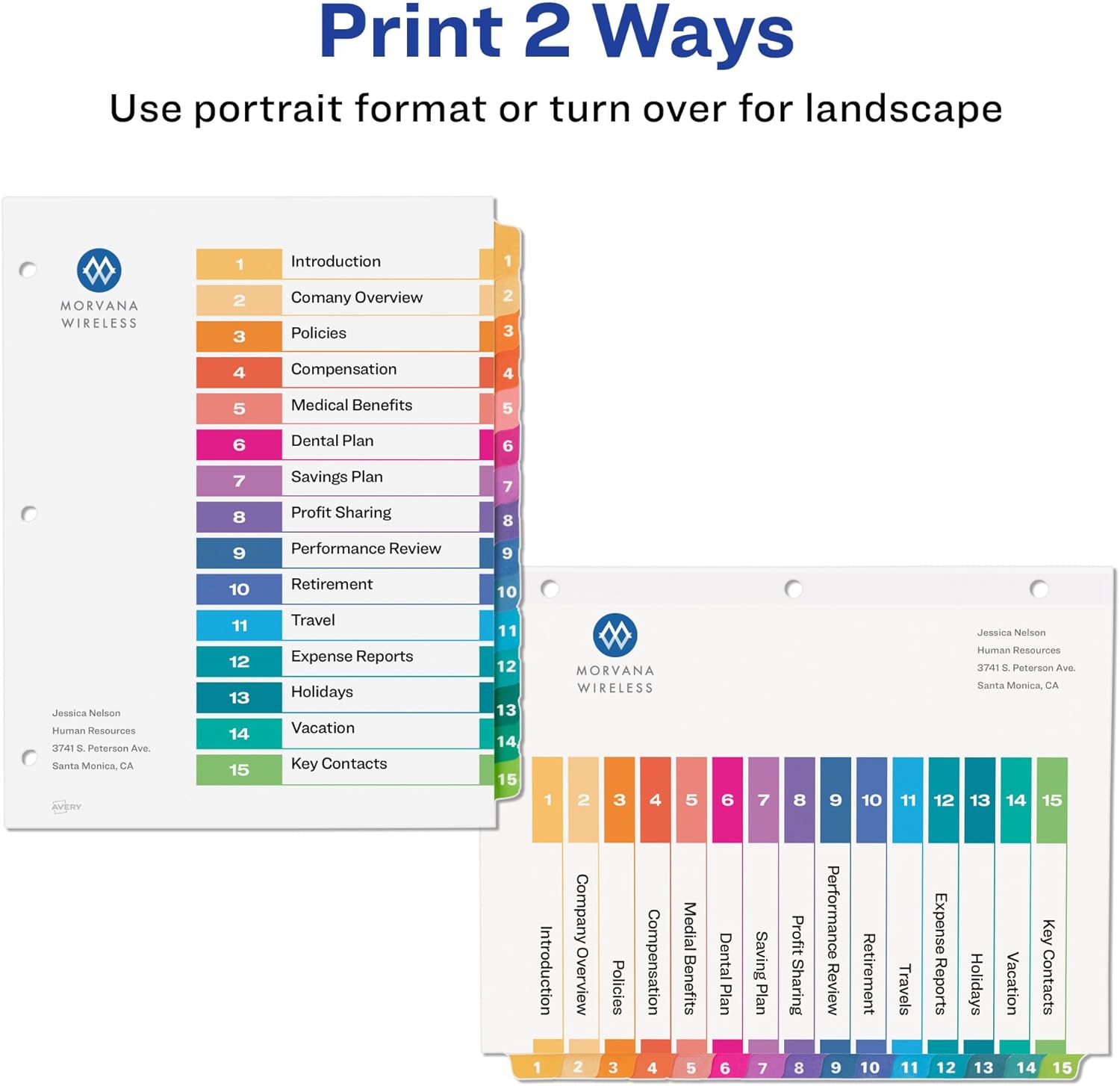 Avery 15 Tab Dividers for 3 Ring Binders, Customizable Table of Contents, Multicolor Tabs, 6 Sets (11197)