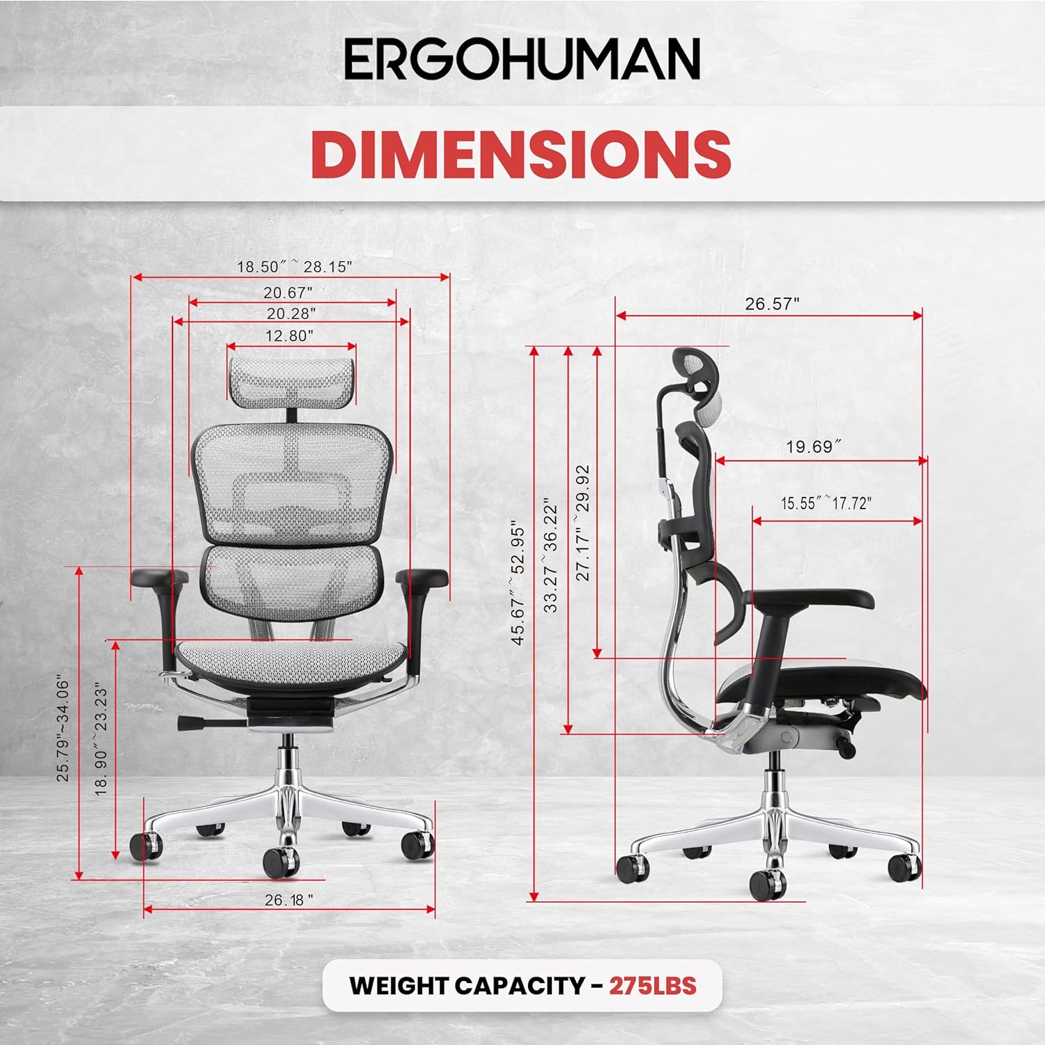 - With overall dimensions of 26.18'' x 26.57'' x 44.69-51.18'' (W x D x H), the seat measuring 20.67'' x 19.69'' (W x D), and the backrest at 20.67'' x 27.17-29.92'' (W x H), ensuring ample space and a weight capacity of 275 lbs for a comfortable and accommodating seating experience.