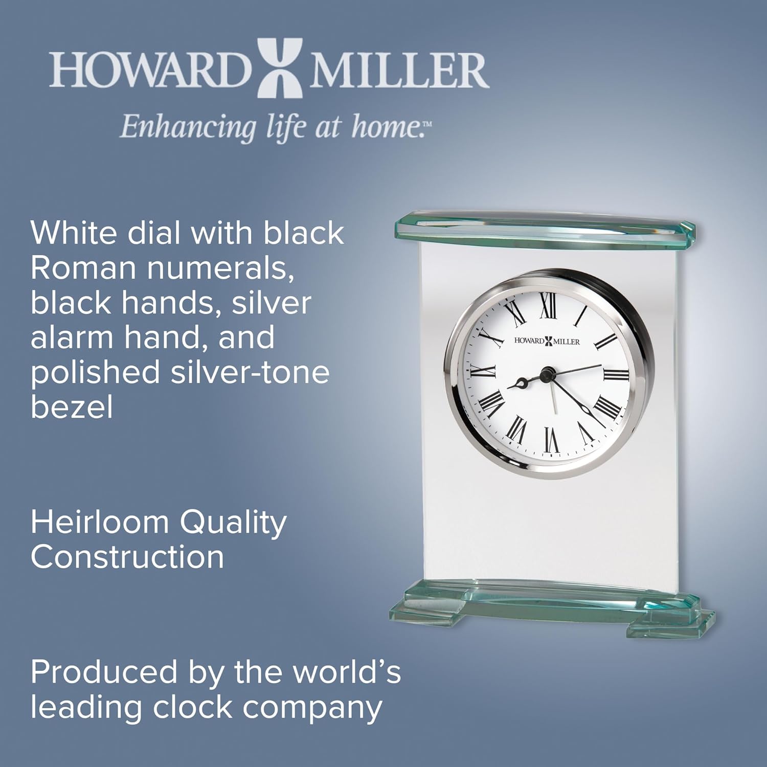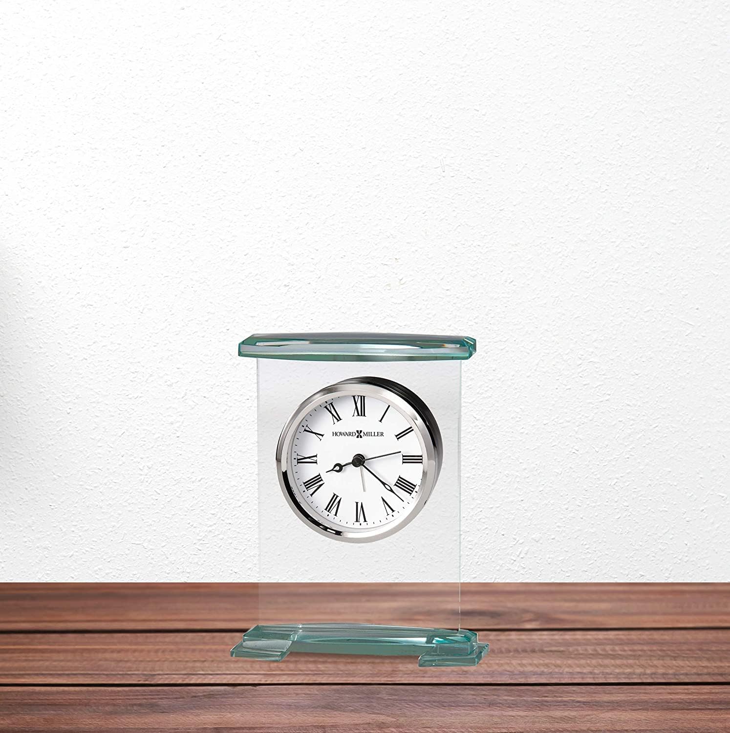 Howard Miller Augustine Tabletop Alarm Clock - Glass Bracket Style, Silent Quartz Movement, Modern Desk Clock with Roman Numerals, Battery Operated, Perfect for Home or Office Decor