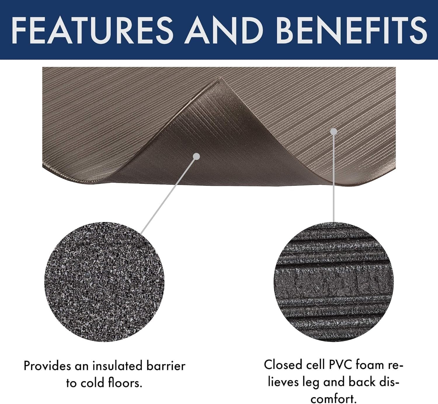 - Reduced Strain - This industrial anti fatigue mat is made of closed-cell PVC foam which alleviates leg and back discomfort while providing insulation against cold floors, making it perfect for use as a shop floor mat