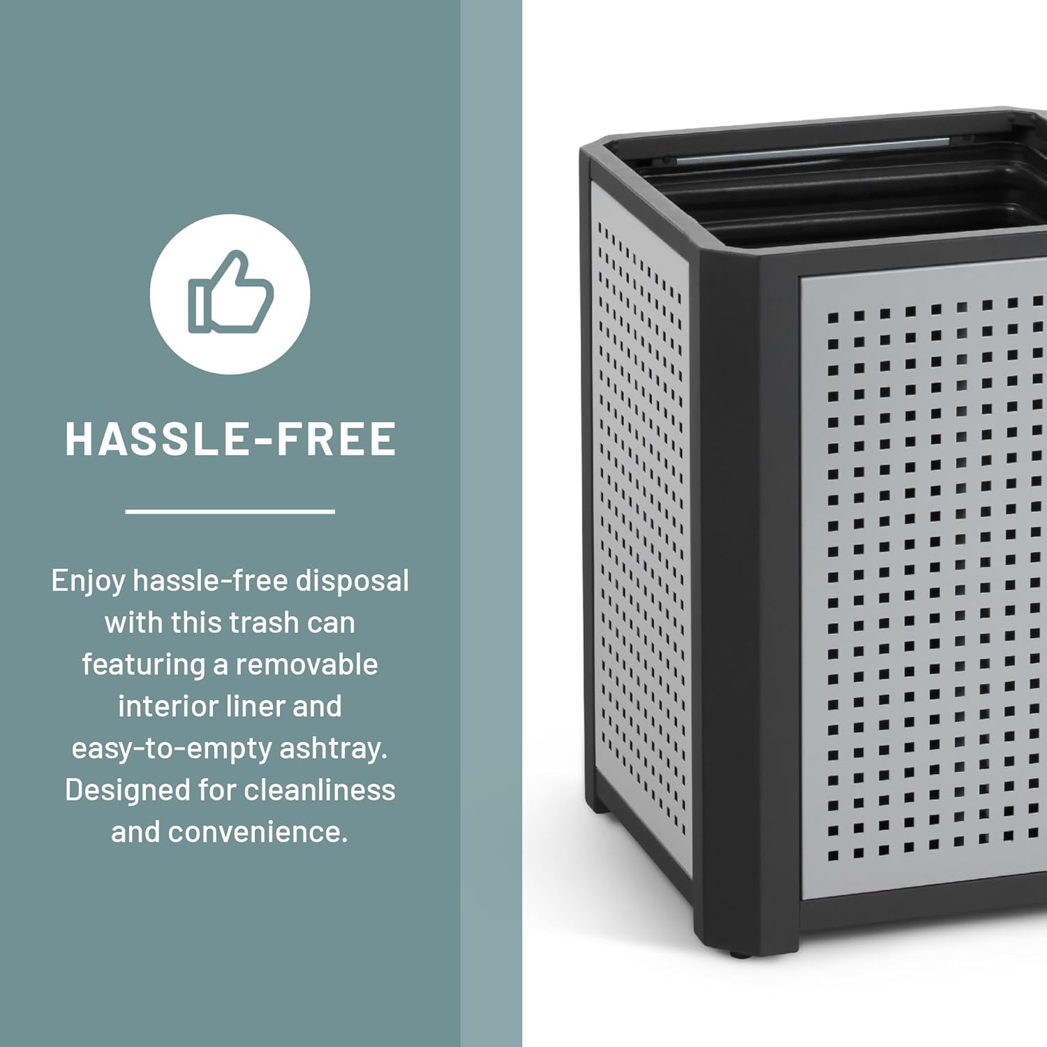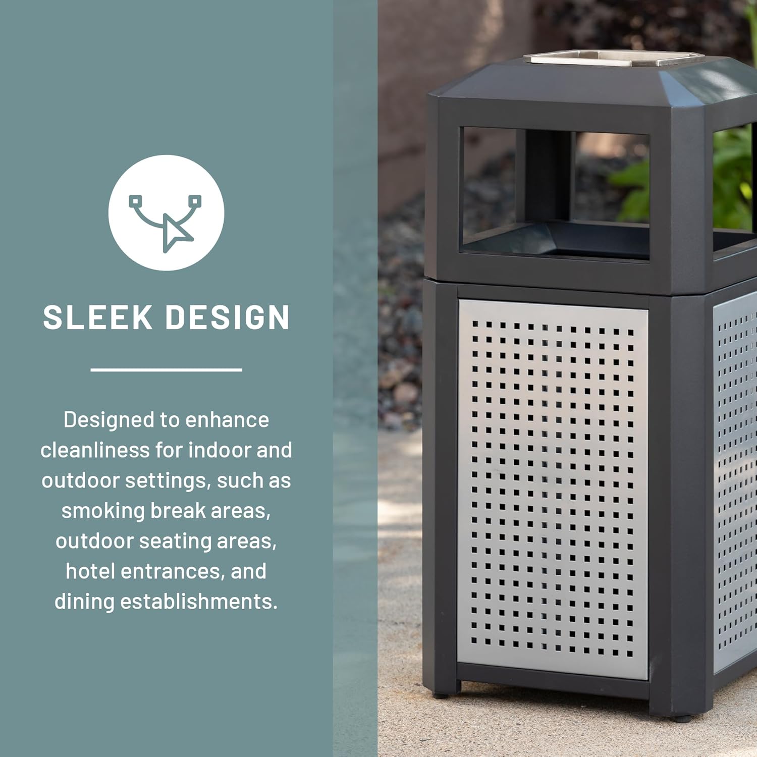 - MODERN STYLING. Evos Outdoor and Indoor Steel Trash Can with Ash Urn features four stylish perforated panels, four convenient openings and a built-in stainless steel ashtray that enhances high traffic areas while keeping them clean and litter free.