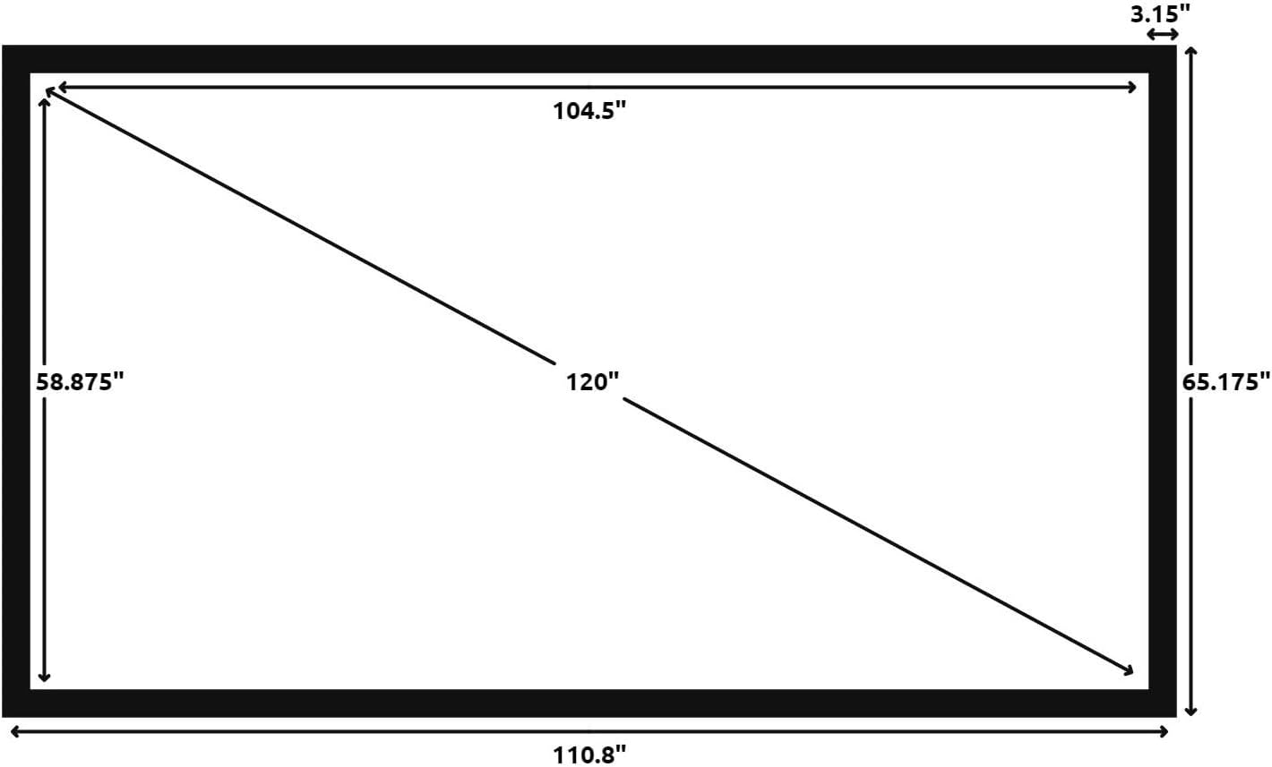 - Wall Mounted Fixed Frame Projection Screen (Overall Size 65.175" Tall x 110.8" Wide) (Viewing Area 120" Diagonal x 58.875" Tall x 104.5" Wide) No option for Legs or Stands with this product. Recommended for projectors with Native 16:9 Resolution