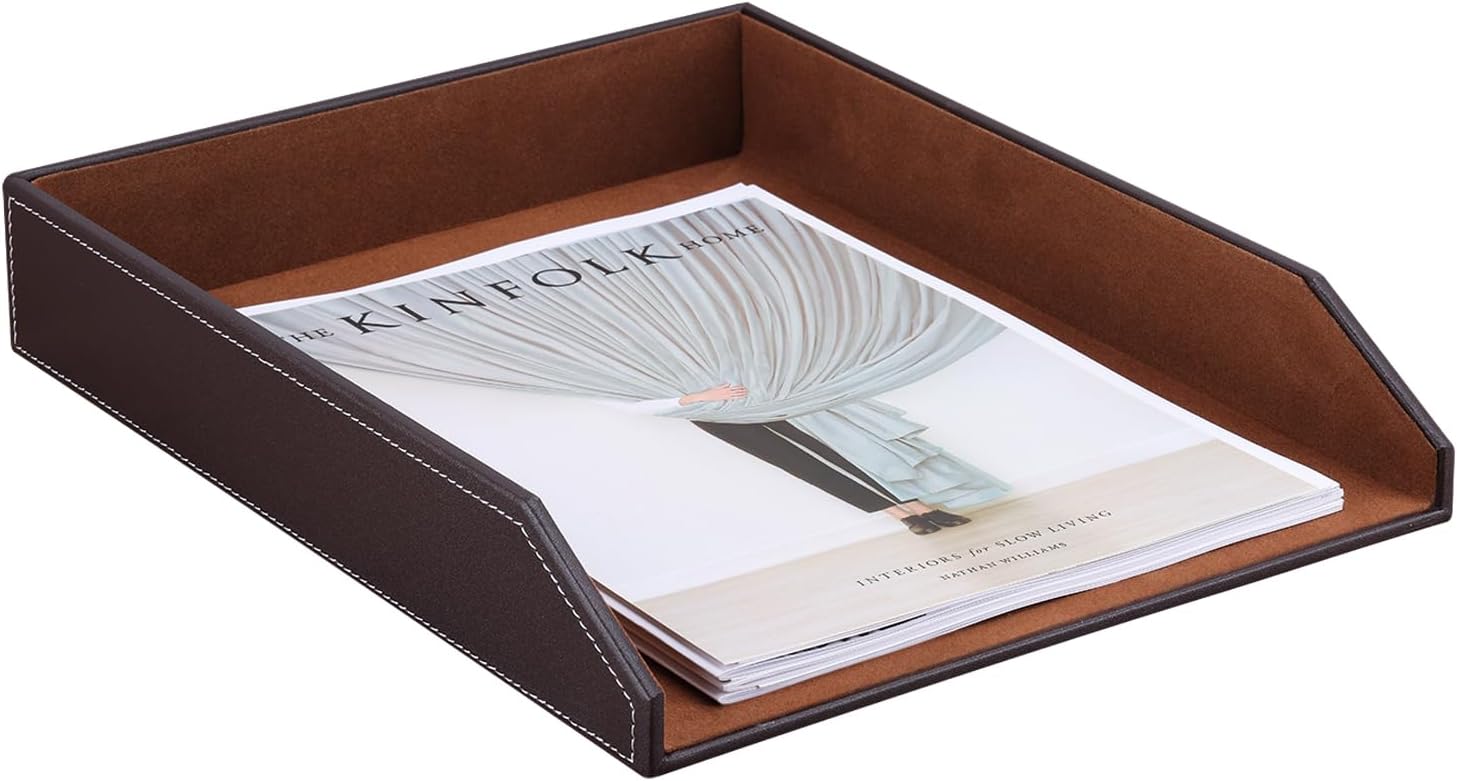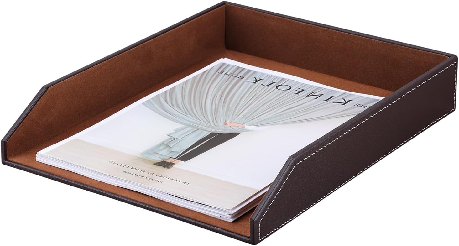 KINGFOM Letter Tray, PU Leather Paper Organizer Tray for Desk, Paper Organizer Storage Holder for Office Home or School A4 Size Brown