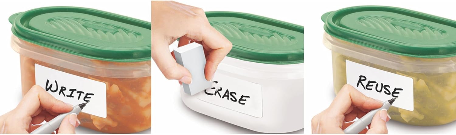 - EASY TO USE AND ERASABLE – the adhesive allows for easy application to your food plastic or glass container or plastic food storage sandwich or freezer bags, jars and any type of container that can be found in your kitchen. Use the eraser or a small amount of rubbing alcohol toe remove the permanent marker notations.