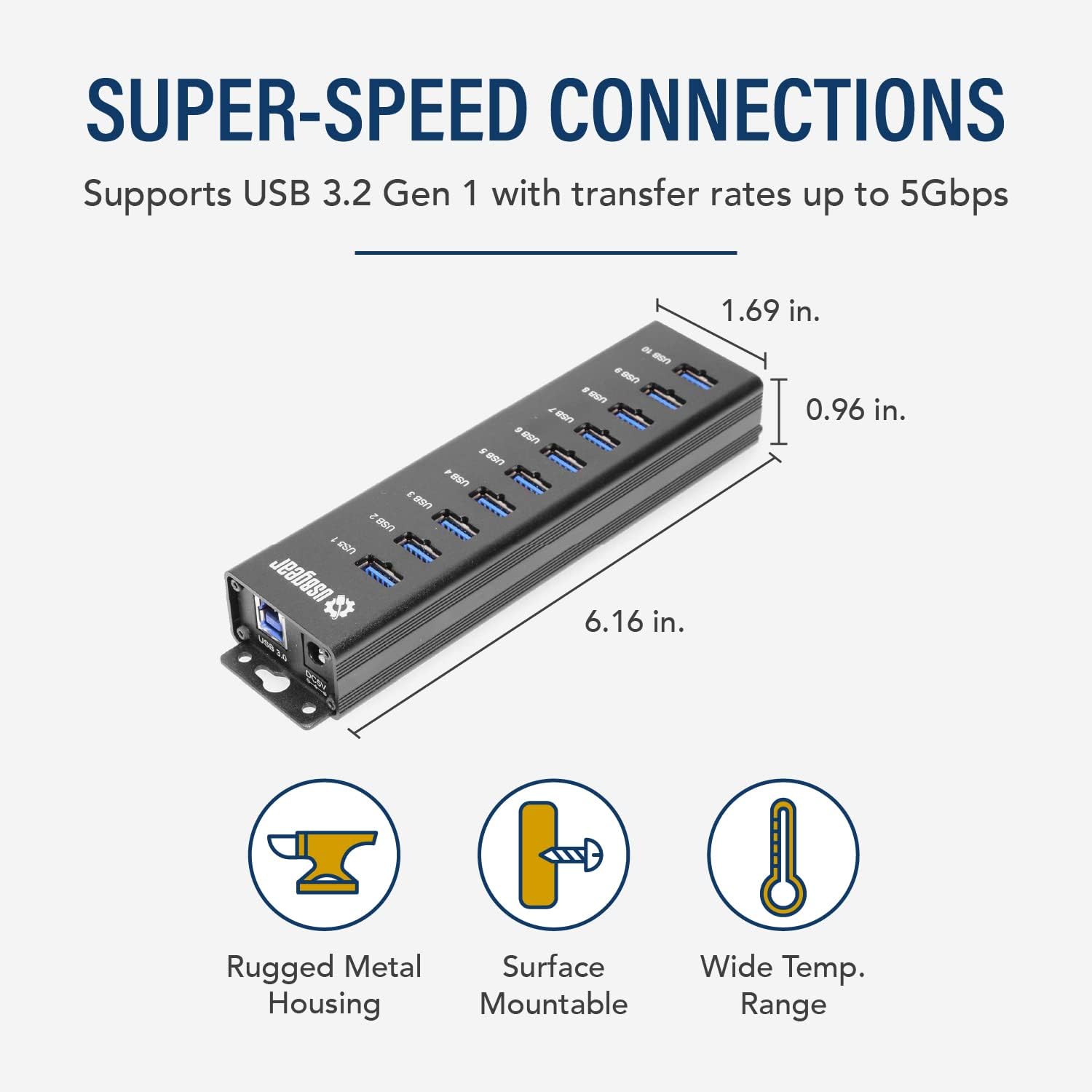 10-Port USB 3.2 Gen 1 Mountable Charging and SuperSpeed Data Hub with 5V/4A Power Adapter and USB Type-A to Type-B Cable Up to 900mA per Port Charging Function Wall and Surface Mounting
