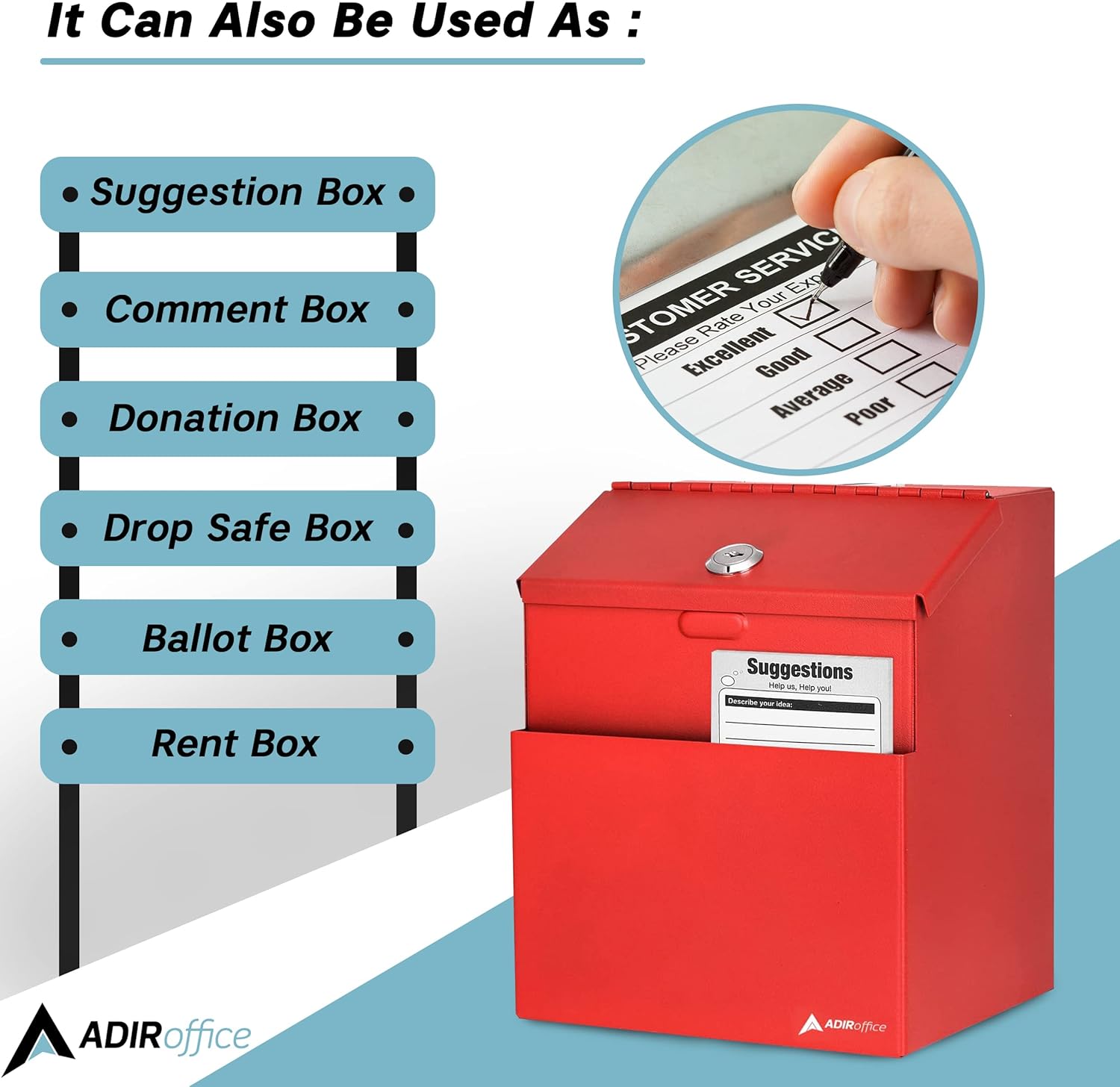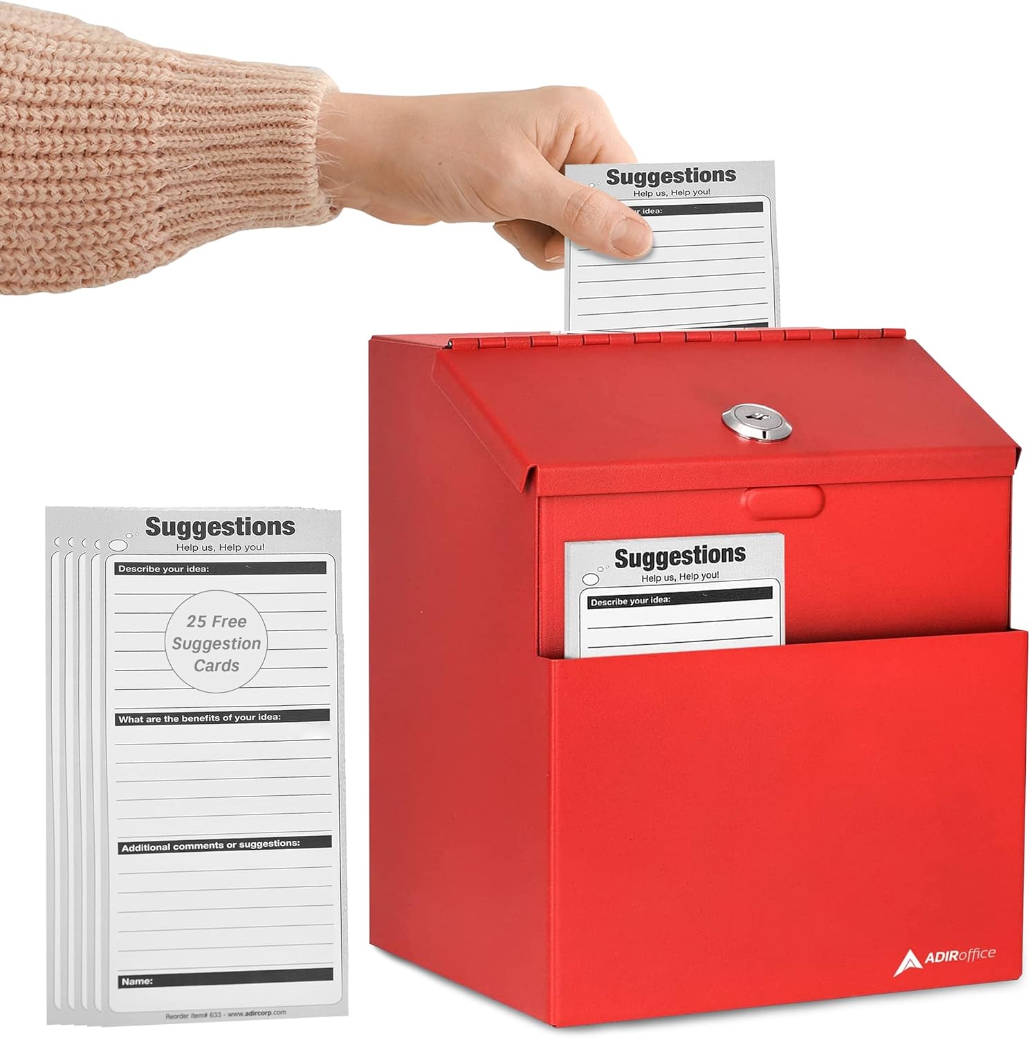 Adir Suggestion Box with Slot and Lock with 25 Comment Cards and Label Stickers, Wall Mounted Metal Donation Box for Fundraising, Tip Cash Drop Box for Money, Ballot Box Red