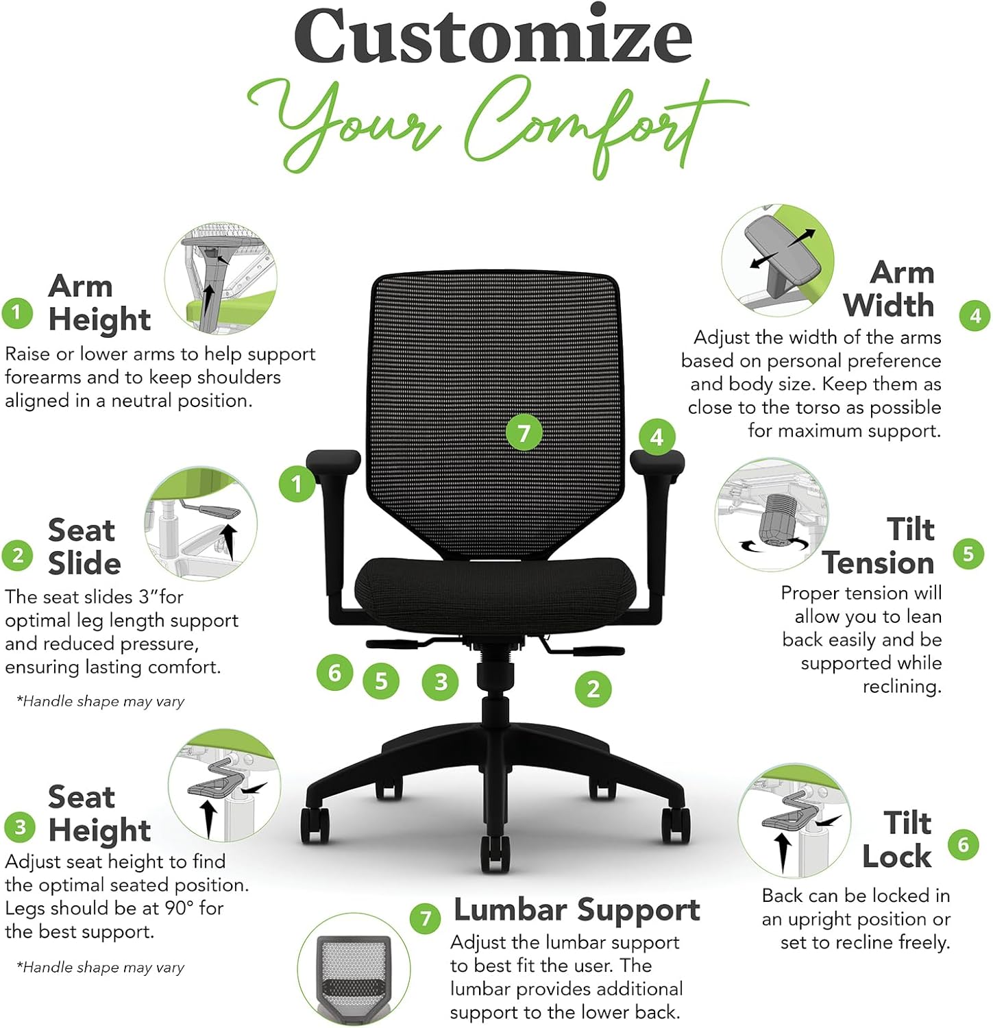 - ERGONOMIC ADJUSTMENTS: Let this adaptable task chair conform to your body with synchronized back and seat movement, adjustable arms for upper body support and pneumatic height adjustment plus seat glide controls