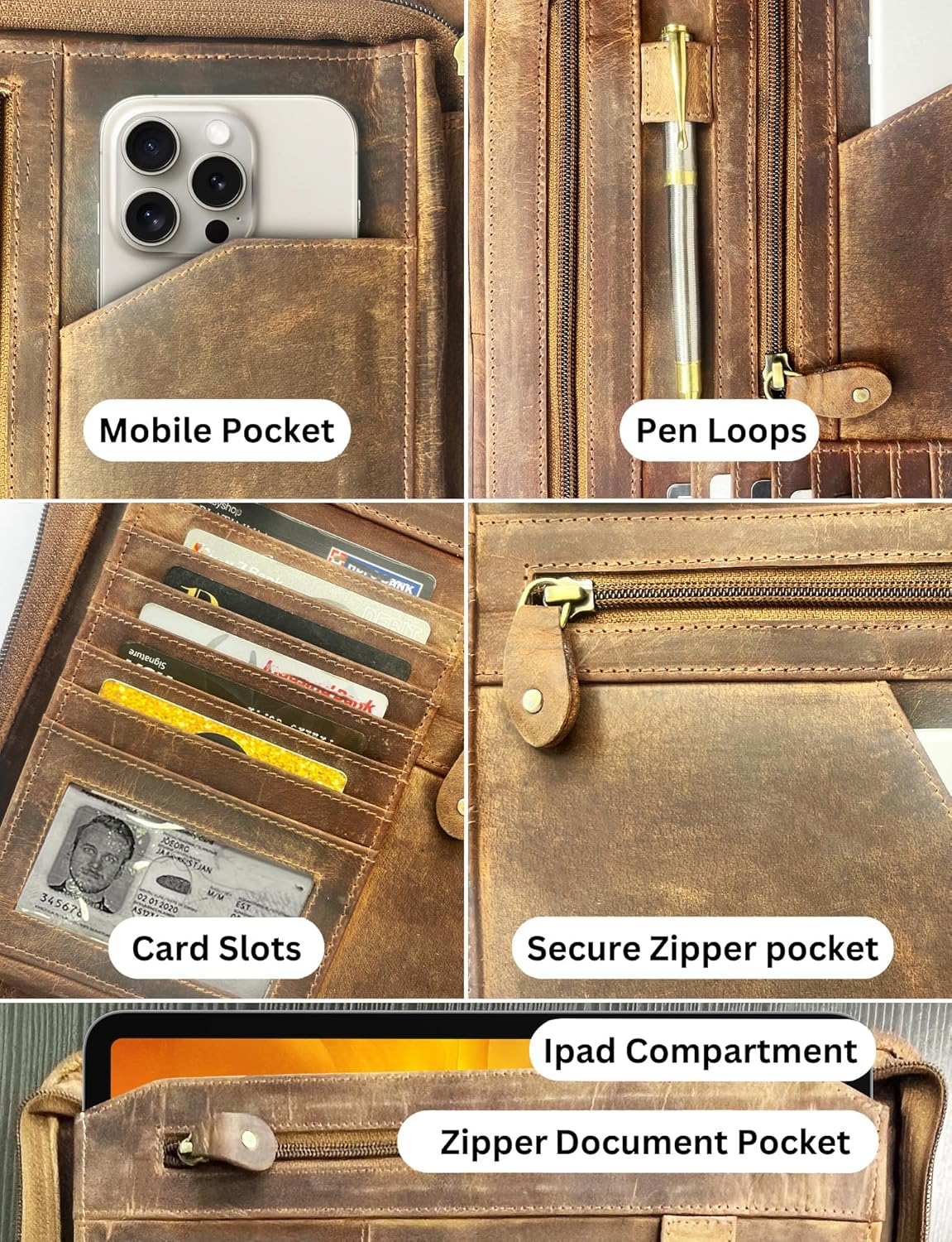 - √ SECURITY OF ZIPPERED CLOSURE: We understand security of your digital and paper contents is important to you and this padfolio is secured with a wrap-around high duty zip and an extra inner zippered pocket to ease your mind