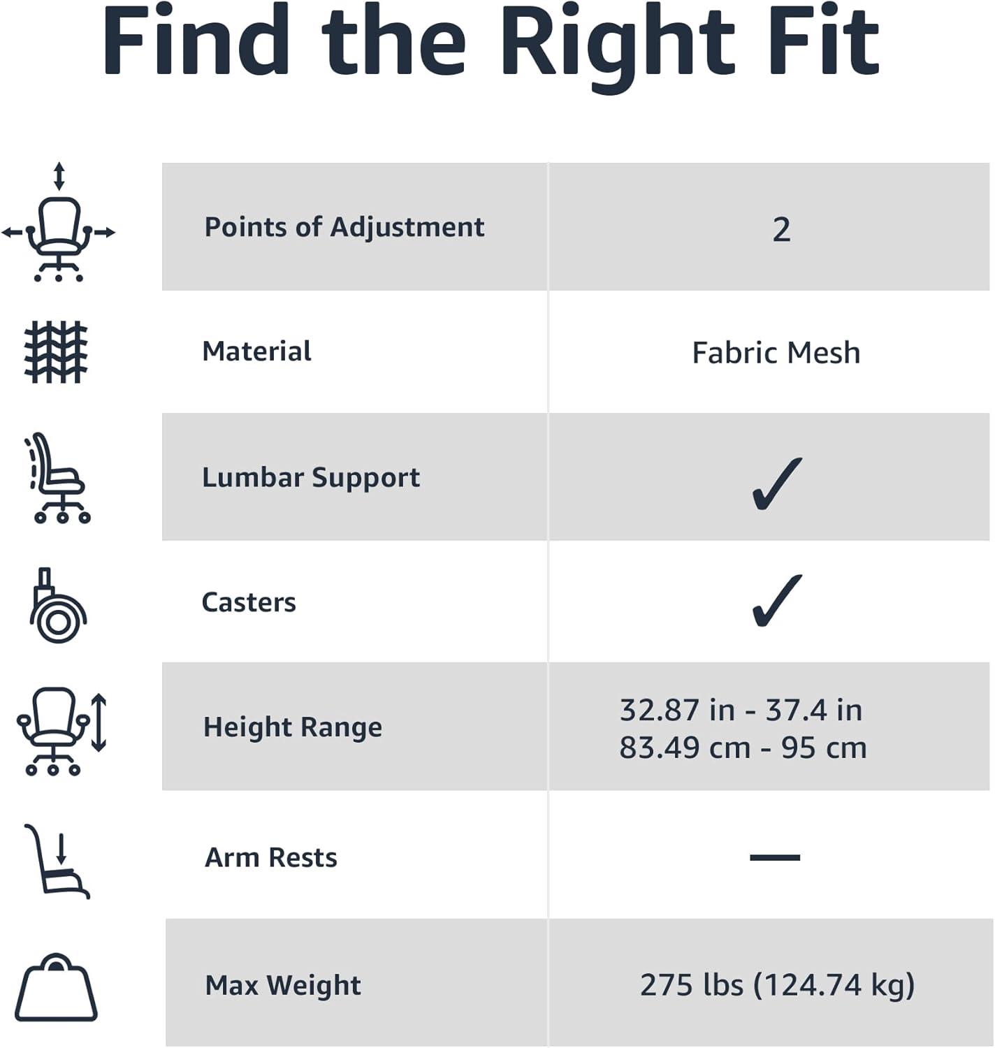 Amazon Basics Rolling Desk Chair, Adjustable, Low Back, Padded Seat, Breathable Mesh, Swivel, Blue, 21.25" D x 22.5" W x 38" H