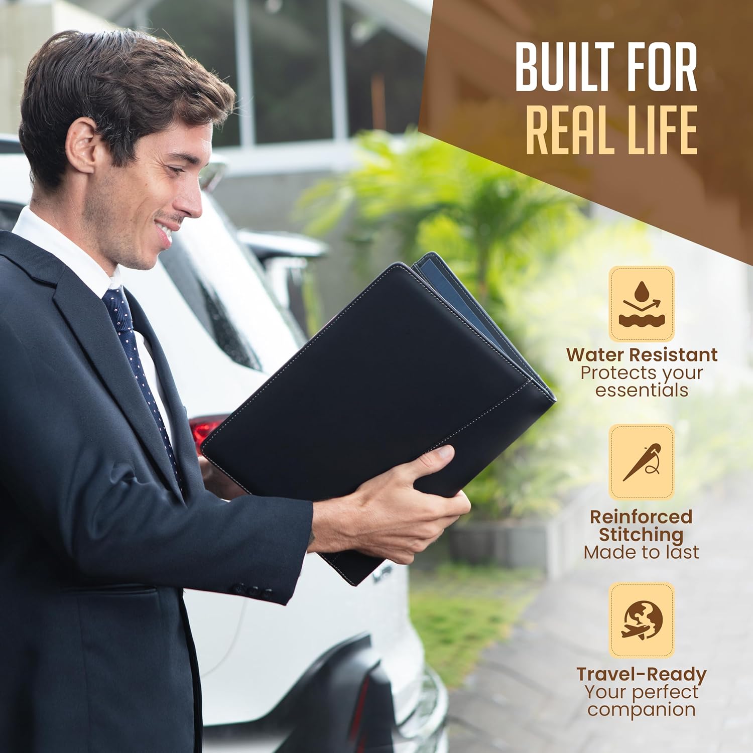 - ✅ STYLE MEETS FUNCTION – Elegant design featuring convenient, safe pockets ideal for documents, business cards, travel tickets, pitch proposals & resumes. Includes a pen holder & refillable writing pad