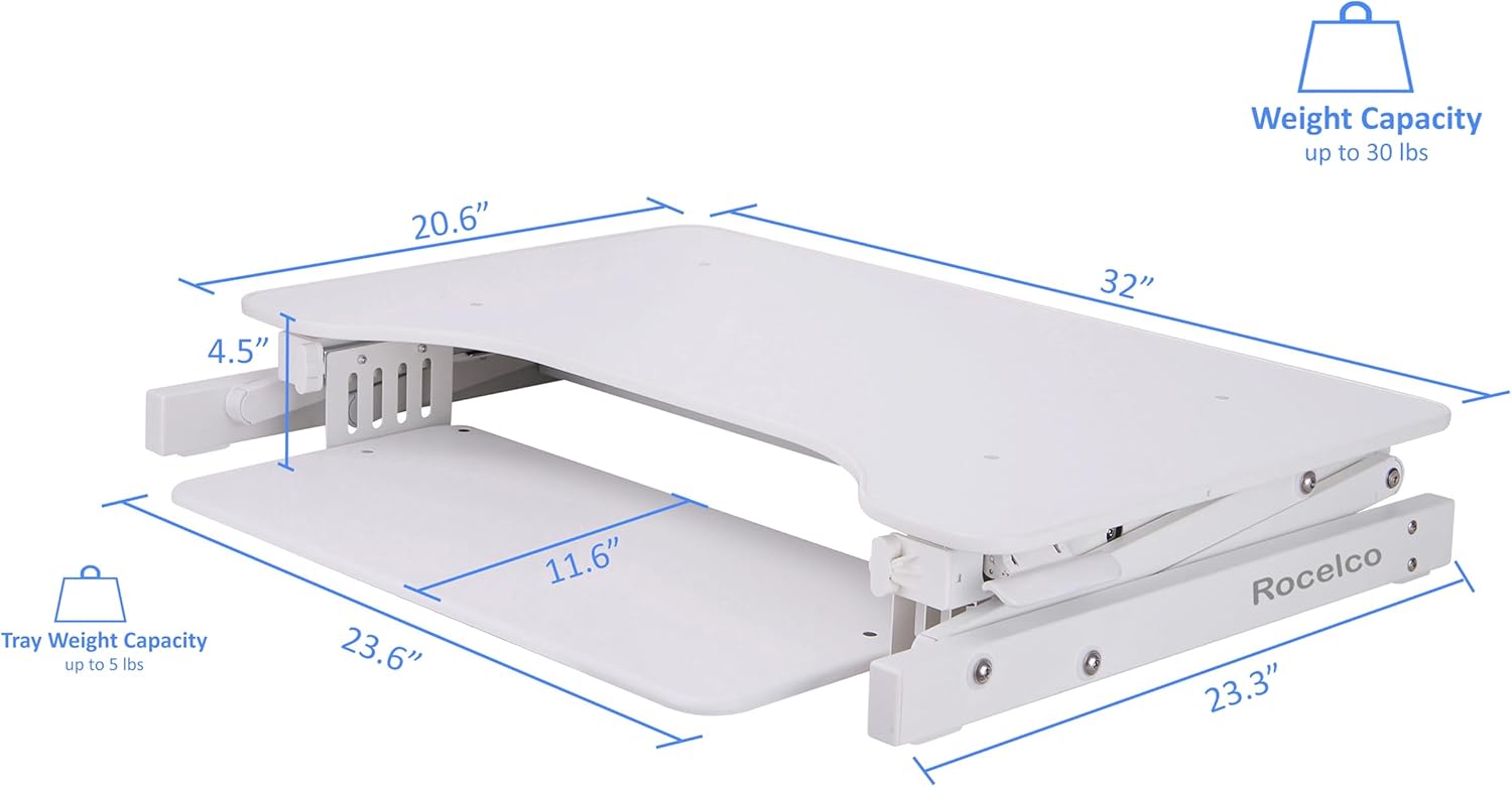 Rocelco 32" Height Adjustable Standing Desk Converter - Quick Sit Stand Up Dual Monitor Riser - Gas Spring Assist Tabletop Computer Workstation - Large Retractable Keyboard Tray - White (R ADRW)