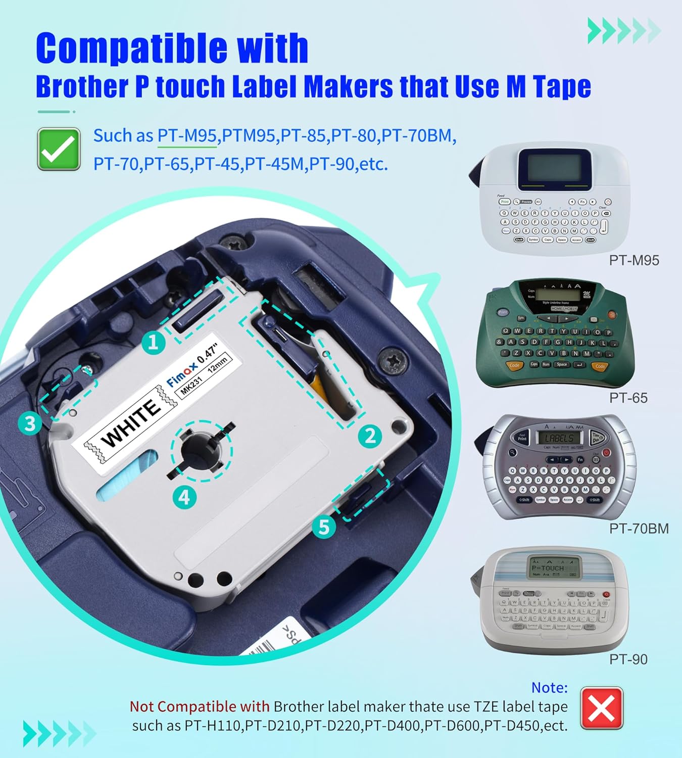 - M-K231 Label Tape Compatible for Brother P-touch Label Maker use M Tape: PTM95, PT-M95, PT-90, PT-M90, PT-70, PT-85, PT-80, PT-70BM, PT-65, PT-M65, PT-45M, PT-55, PT-55S, PT-55BM, PT-65SB, PT-65SCCP, PT-65SL, PT-65VP, PT-70, PT-70BBVP, PT-70BM, PT-70BMH, PT-70HK, PT-70HOL, PT-70HOT, PT-70SP, PT-70SR, PT-80SCCP Label Makers