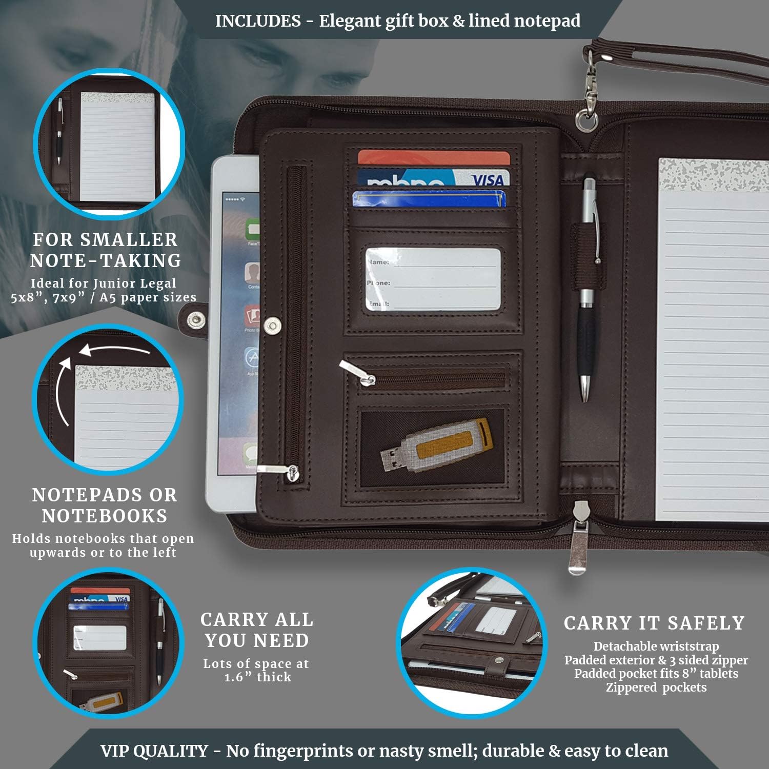 Zippered Portfolio Binder with Junior Legal 5x8 Notepad - Dark Brown PU Faux Leather Business Padfolio Organizer Folder with 8 Inch Tablet Sleeve & Gift Box by Lautus Designs