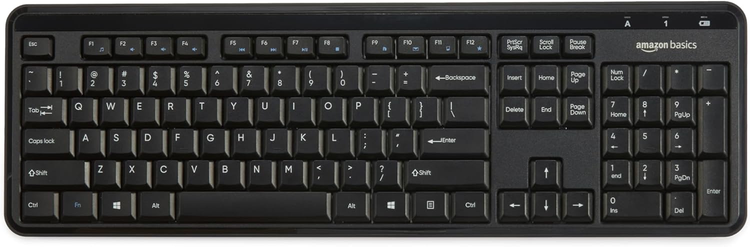 - Keyboard measures 17.7 by 5.6 by 0.9 inches; mouse measures 3.7 by 2.3 by 1.3 inches; backed by an Amazon Basics limited 1-year warranty
