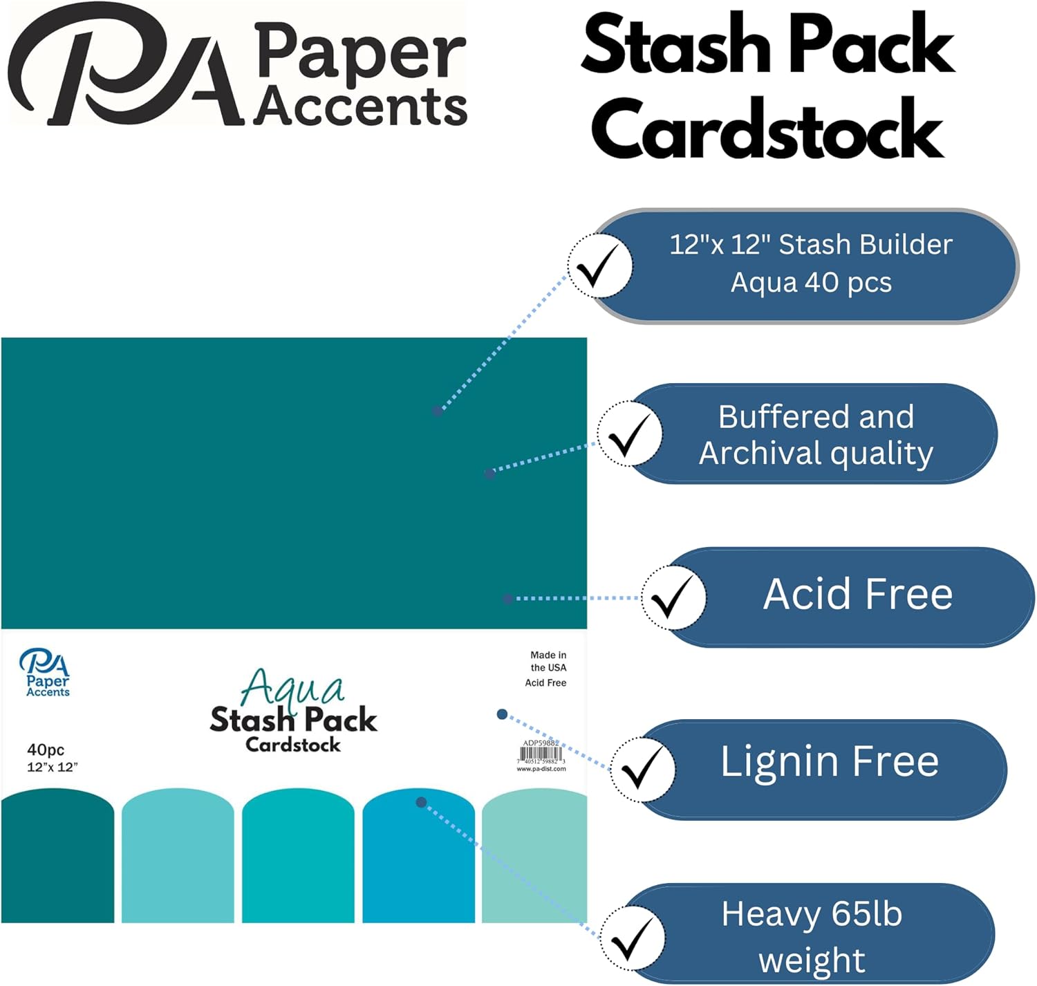 PA Paper Accents Stash Pack Cardstock Pack 12" x 12" Aqua colored cardstock paper for card making, scrapbooking, printing, quilling and crafts, 65lb., 40 pieces