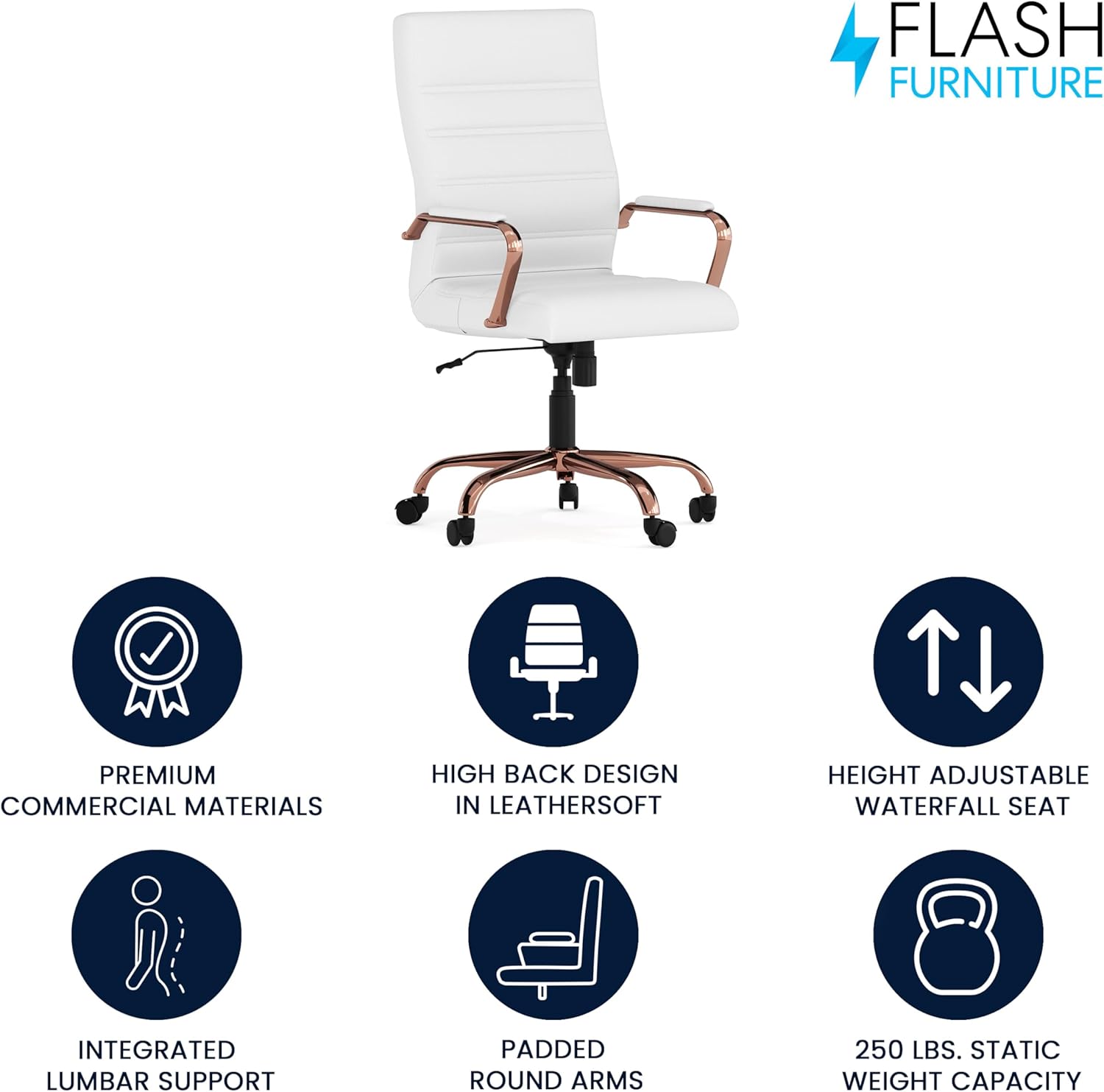 Flash Furniture Whitney High-Back Swivel LeatherSoft Desk Chair with Padded Seat and Armrests, Adjustable Height Padded LeatherSoft Office Chair, White/Rose Gold