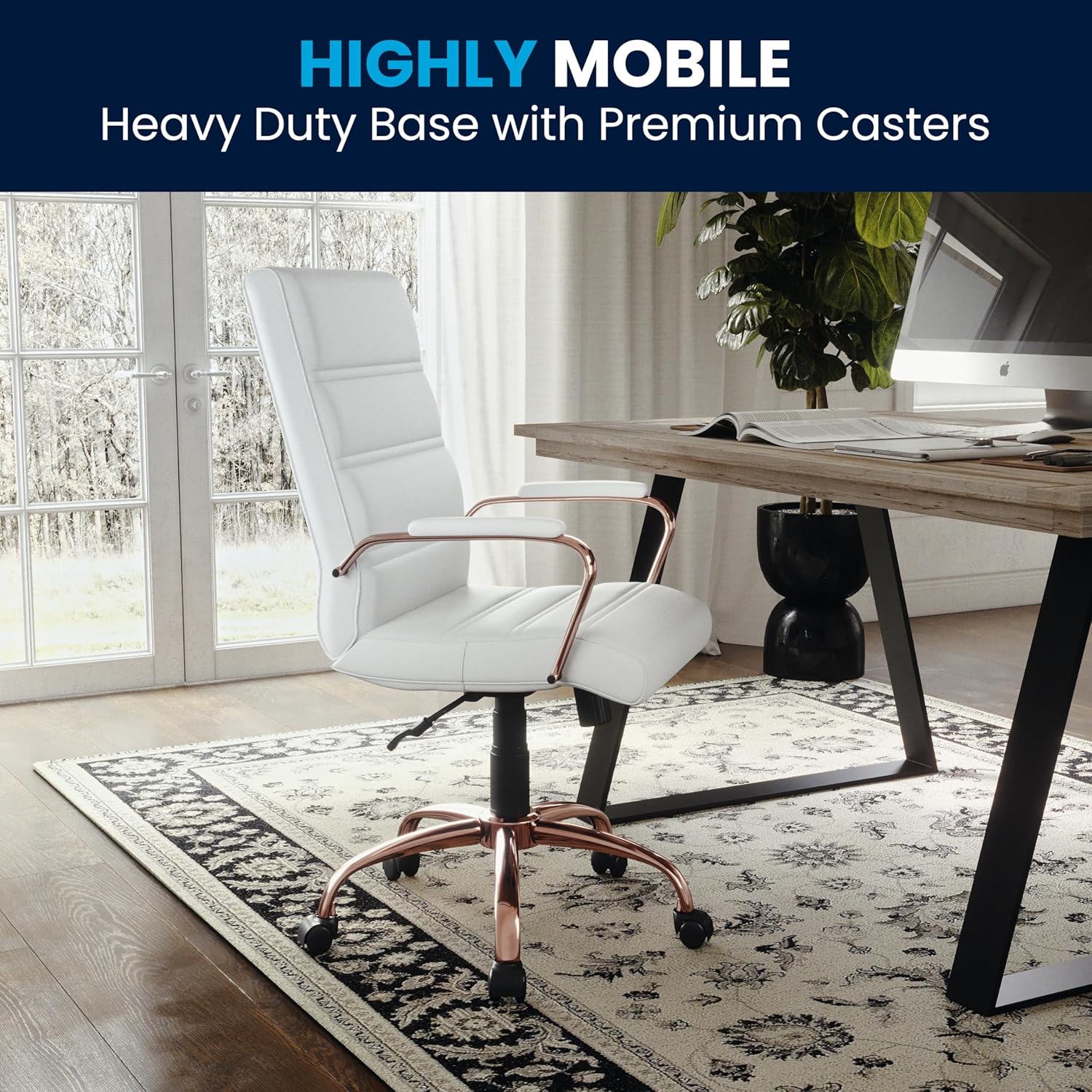 - UPGRADE YOUR WORKSPACE: Boasts a soft mid-back white LeatherSoft back and seat paired with a rose gold metal base and armrests all highlighted by an attractive horizontal line stitching to boost your desk or work area with modern style