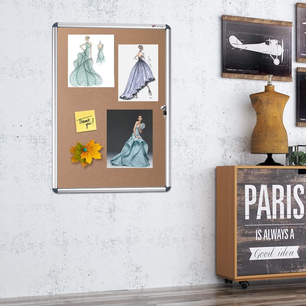 - [High Quality Details] Natural cork backing, self-healing, accepts pins. Shatterproof PET door, Anti-Scratch Silver finished Aluminium frame and ABS round plastic corners