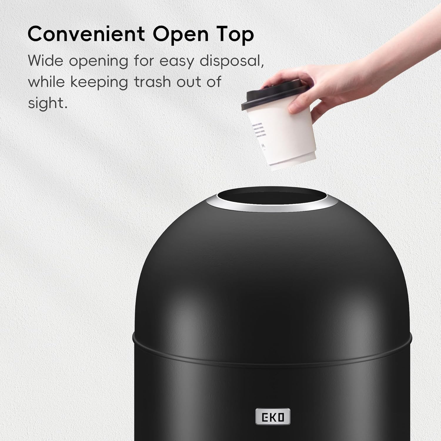 - Convenient Wide Open Top: Dispose of garbage without touching the can. The dome shaped open top makes disposal easy while concealing trash away from view.