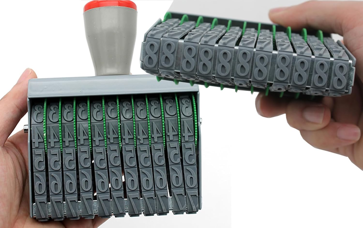 - 11 Adjustable Wheels: Set numbers (0-9) and symbols (#, X, %, etc.) on each belt for custom imprints