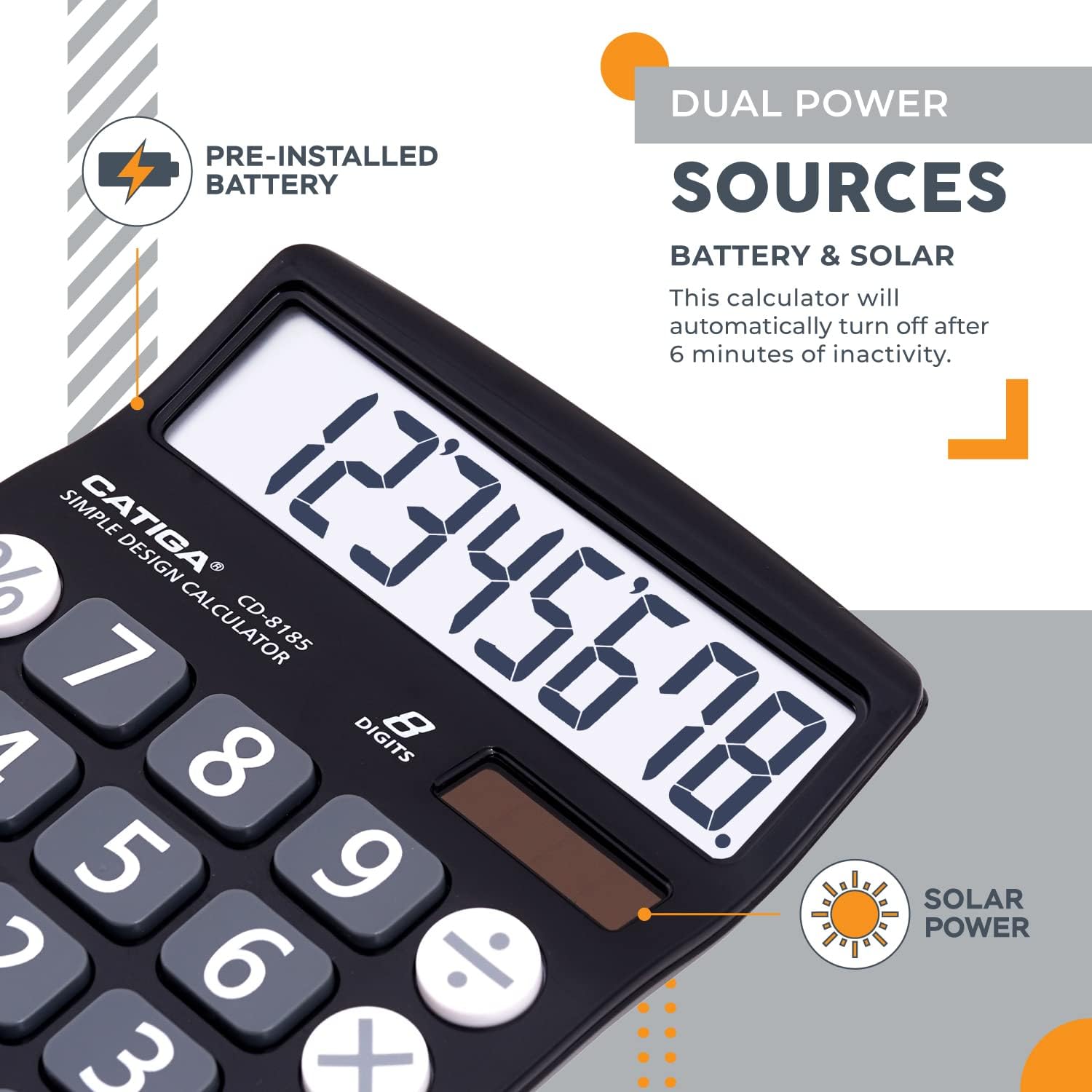 - DUAL POWER SOURCES - With the aid of its dual solar and battery power system, this calculator is fully powered in any lit environment. The battery comes included with the calculator, ensuring quick and easy access right away. PLEASE NOTE: The calculator will turn itself off after about 6 minutes of being idle.