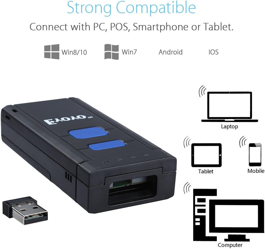 - 3-In-1 Connection Ways: The Eyoyo barcode scanner offers USB, wired, and Bluetooth options for unmatched compatibility. Use 2.4g wireless for stable, efficient data transfer to desktops and laptops. Opt for USB wired connections to avoid interference and secure data. Choose Bluetooth for seamless pairing with mobile devices and apps, such as scoutIQ and Scoutly app. Adaptable to any environment, the EY-2877 streamlines operations and enhances productivity