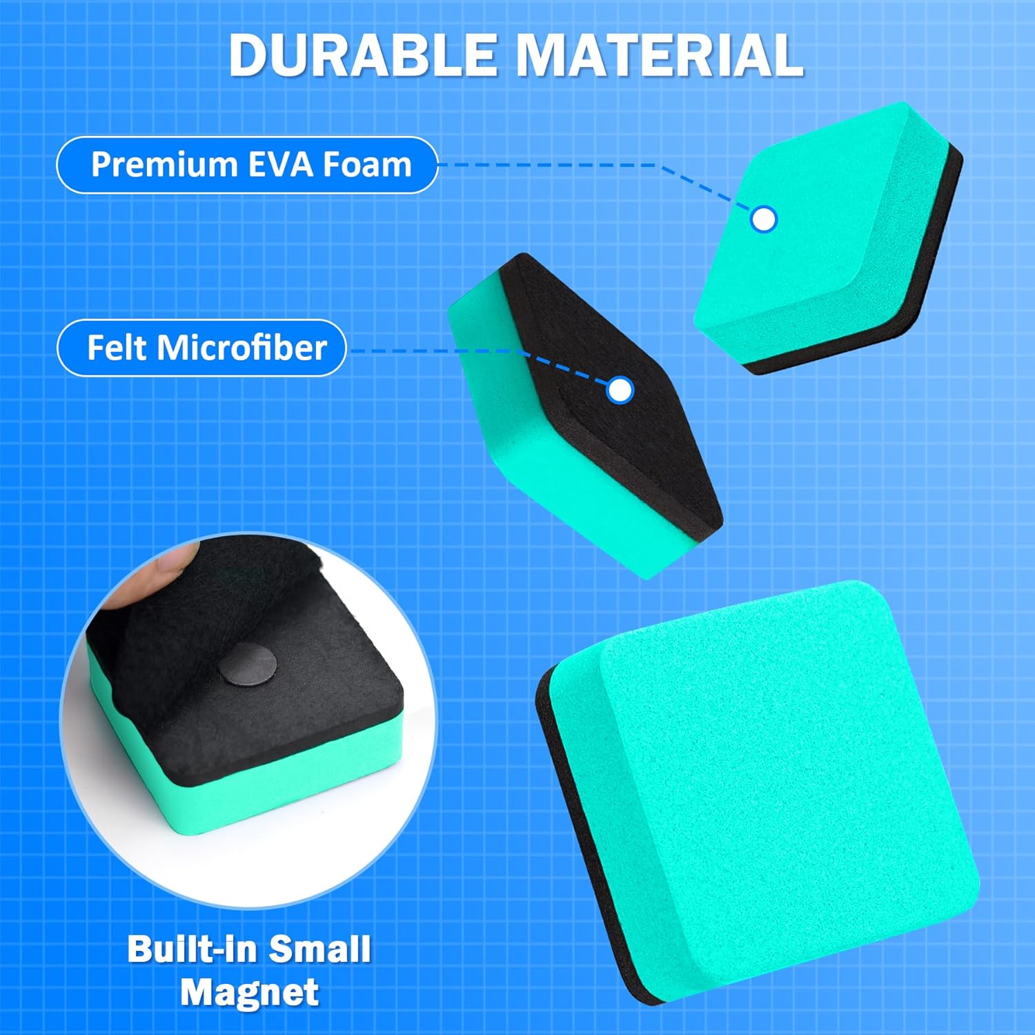 - DURABLE AND WASHABLE: Our dry erasers are made of premium quality EVA foam and high-density felt bottom, non-toxic, and easy to clean the erase markers on glass or white board. And the felt side of the eraser is magnetic and can be absorbed to the whiteboard. The erasers are hand-washable with water and soap for reuse