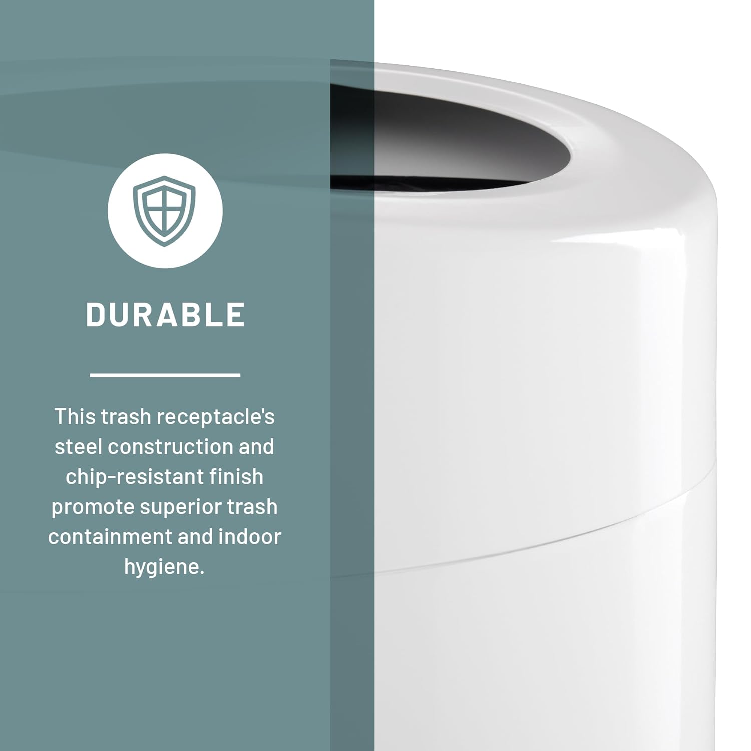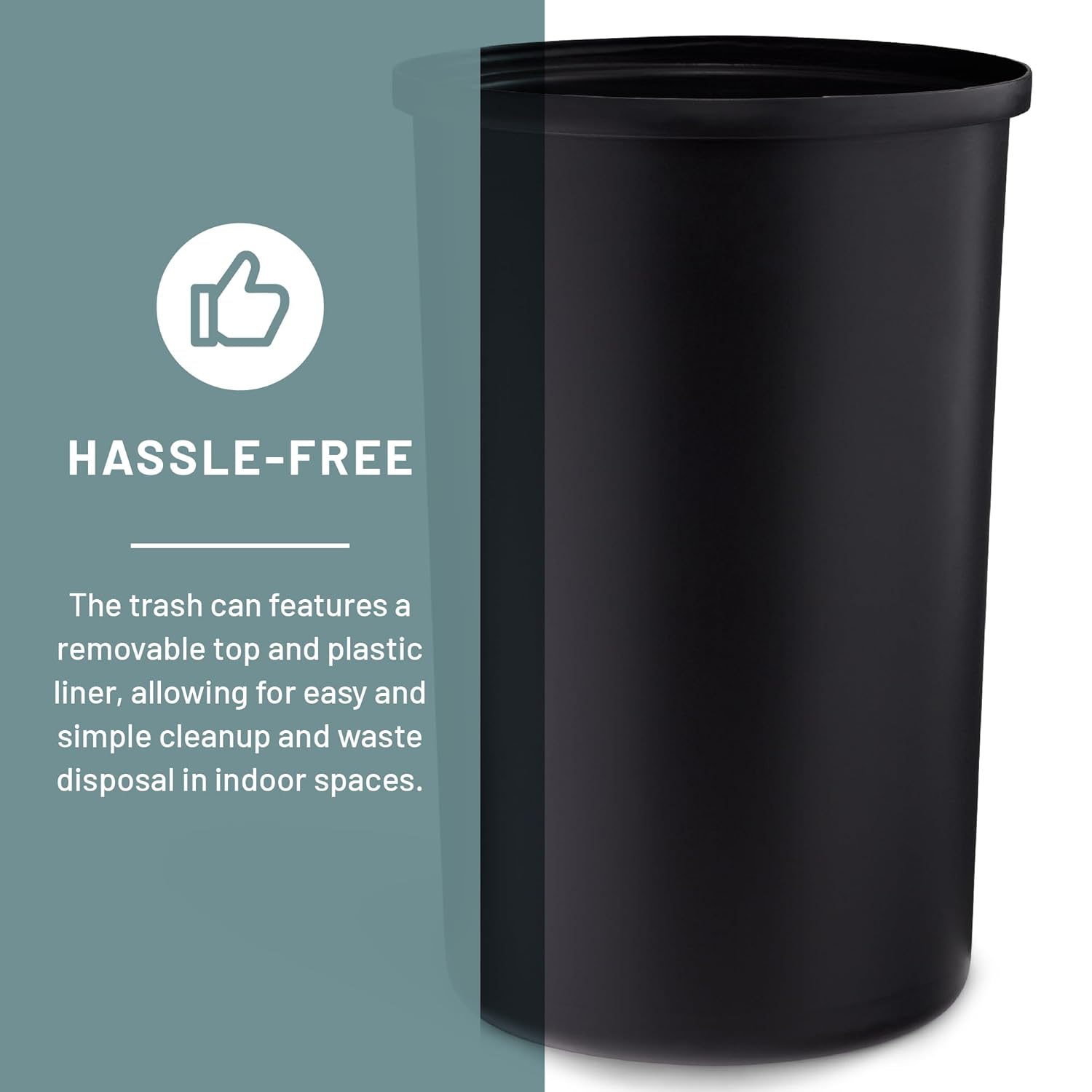 - REMOVABLE LID AND LINER. Lid hides unsightly trash bag and easily removes to reveal a peel-resistant rigid plastic liner for easy maintenance.