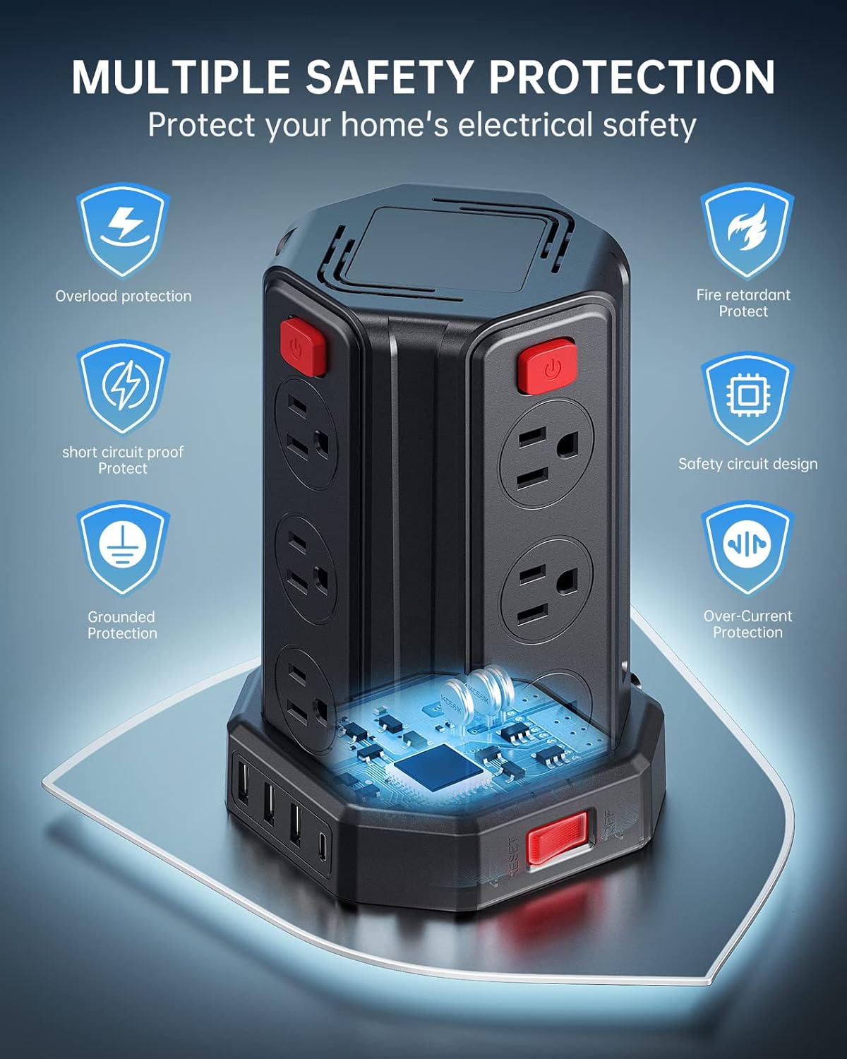 - 【Multiple Safety Protection】This surge protector power strip with USB has 1700j surge protection, overload protection, short-circuit protection, over-current protection, and so on; The power tower can automatically cut off the power when voltage surge is detected to protect your expensive devices like computers, TV at home, office, college dorm, etc.protection, over-current protection, and so on; The power tower can automatically cut off the power when voltage surge is detected to protect your expensive devices like computers, TV at home, office, college dorm, etc.