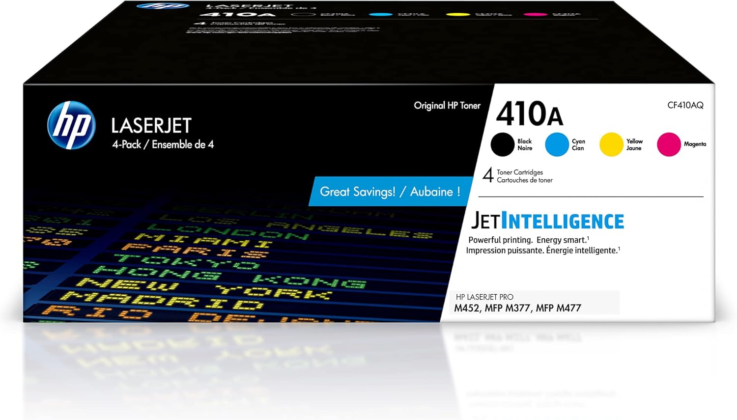- What's in the box: 4 new Original HP 410A Toner Cartridges: 1 black, 1 cyan, 1 magenta, 1 yellow (CF410AQ)