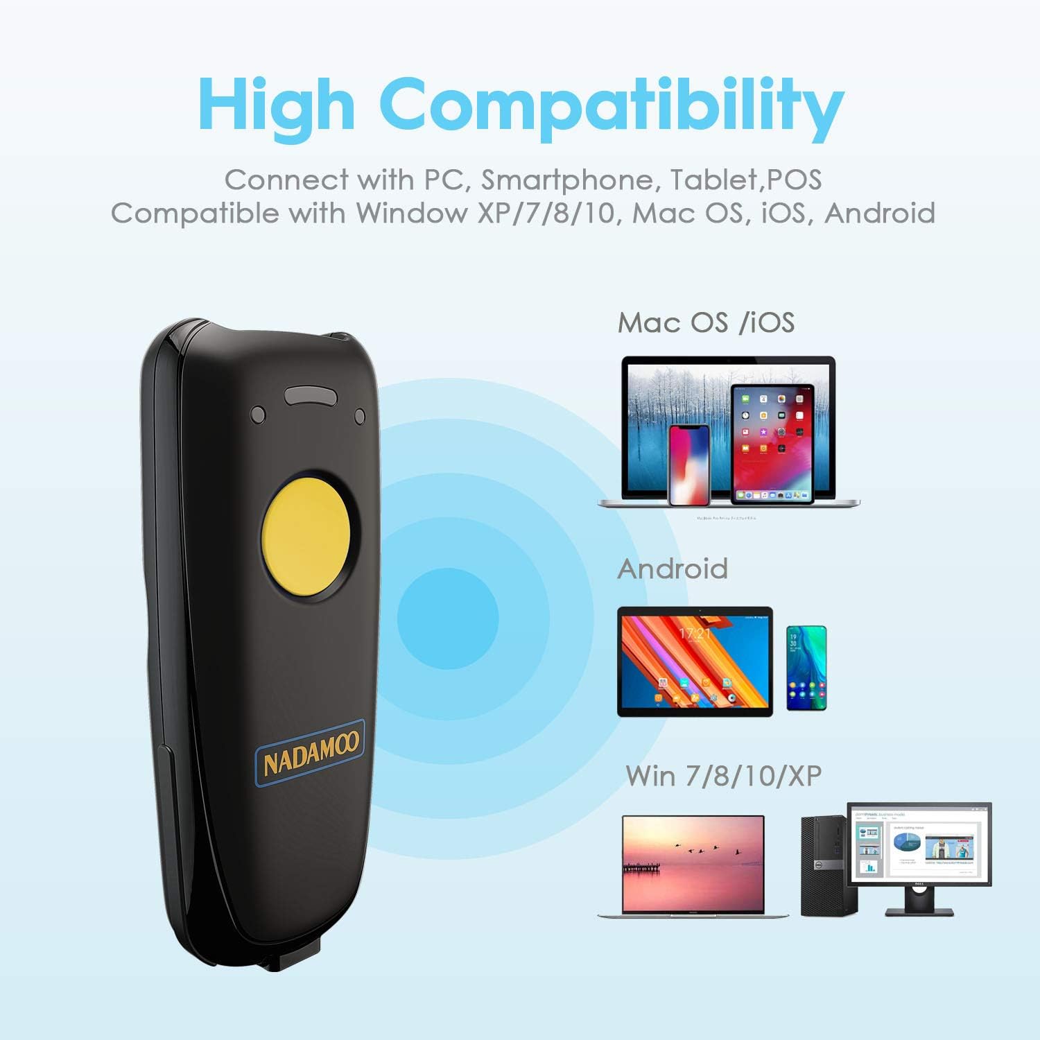 - The portable bar code scanner comes with 3-in-1 Connection Design:Compatible with Blue Tooth Function; 2.4G Wireless connection with the Base receiver; Wired connection. Easily connected with your laptop, PC, mobile phone, tablet, iphone, ipad, POS. Work with Windows XP/7/8/10, Mac OS, Windows Mobile, Android OS, iOS