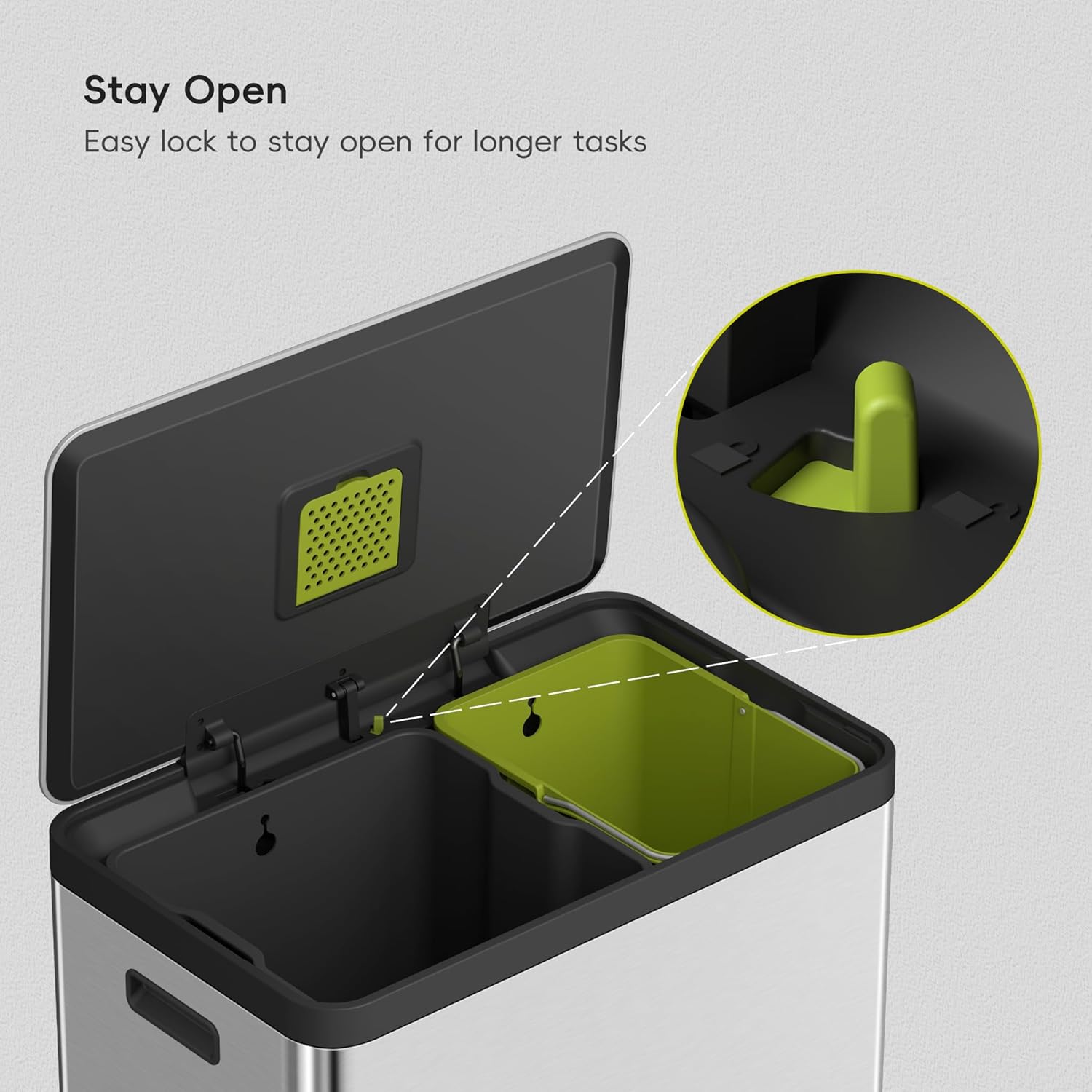 - Dual Compartment Trash Can - Easily distinguish between waste and recyclables with 2 removable, color-coded inner buckets.
