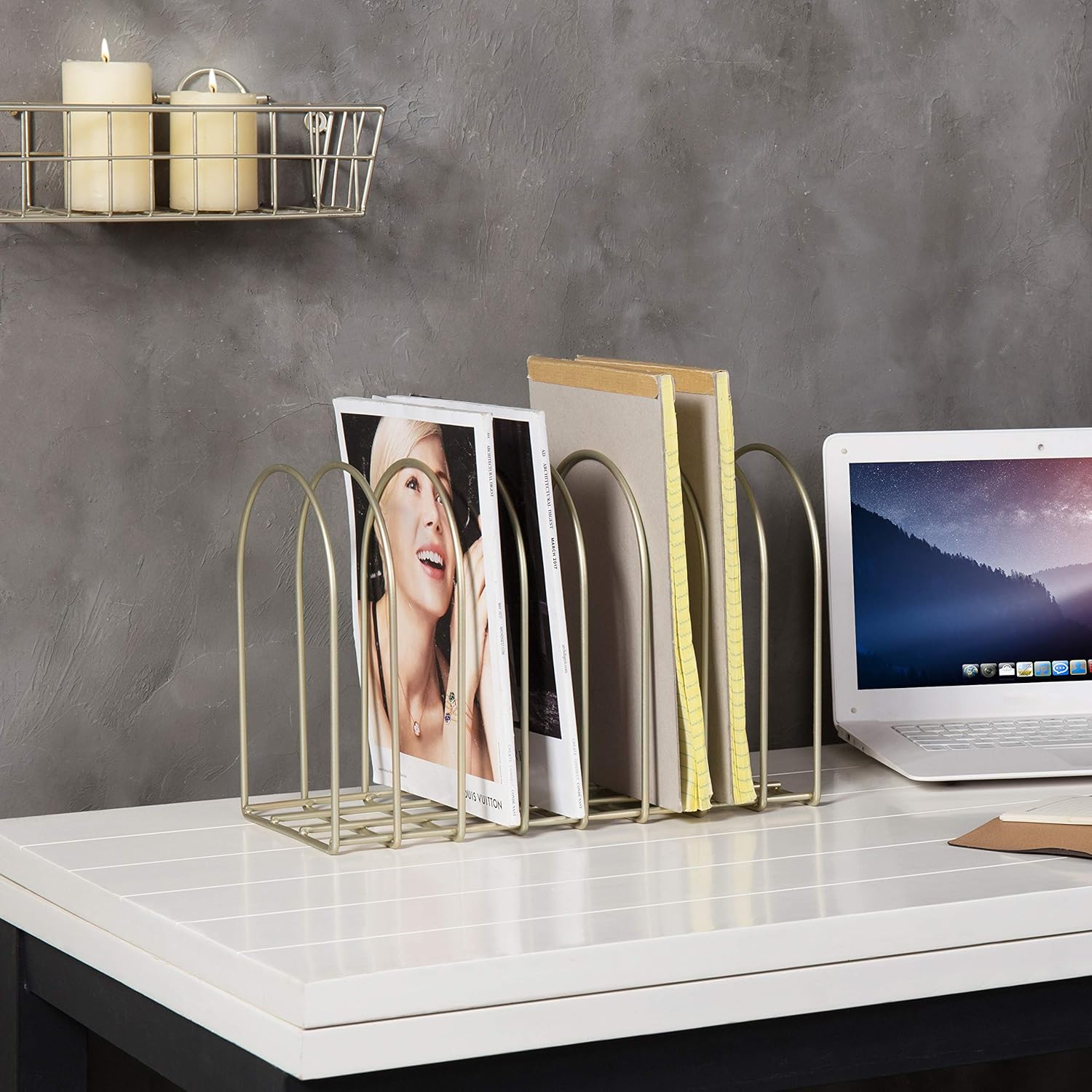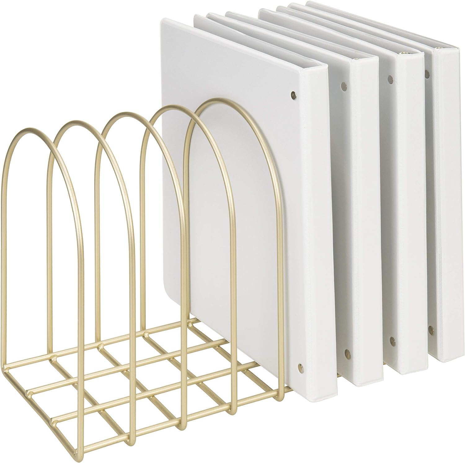 - Brass toned arched design desktop book & file organizer for use in your home or office