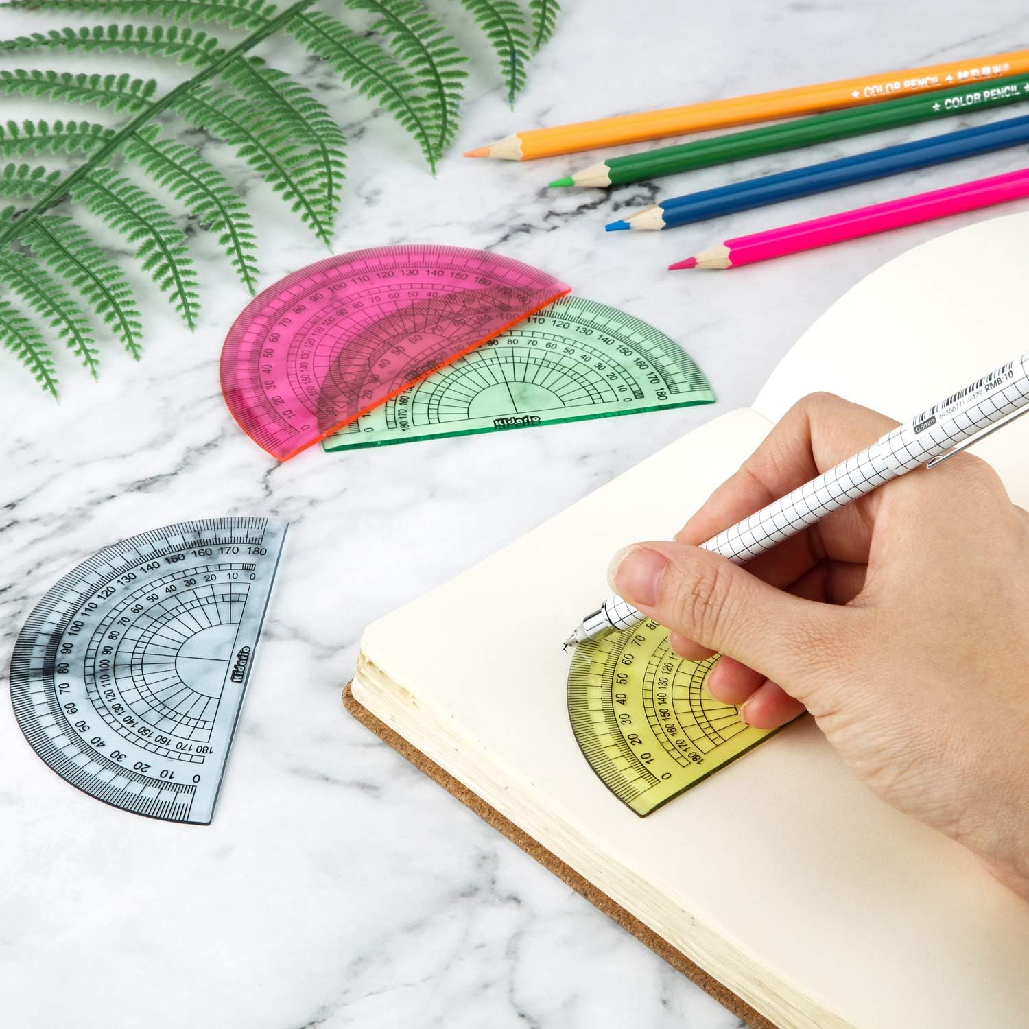 - Assorted colors and good quality: the protractor made of good quality plastic; Assorted color allow you see the words, letters, figures on page through the protractor