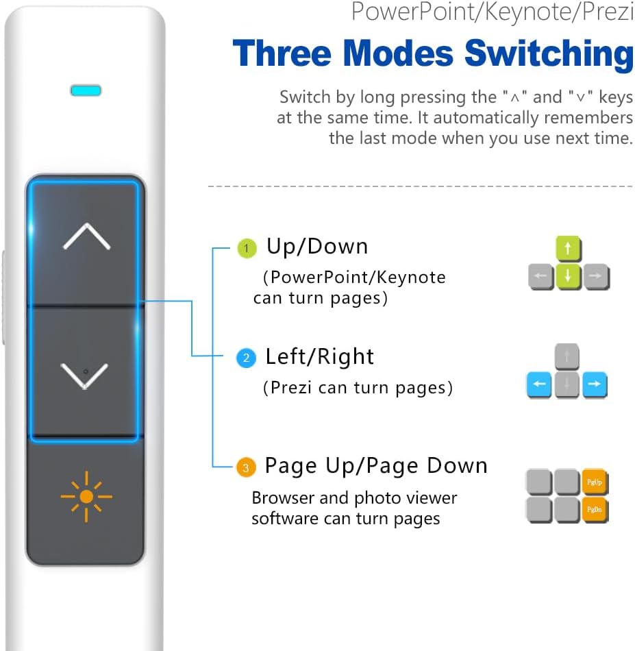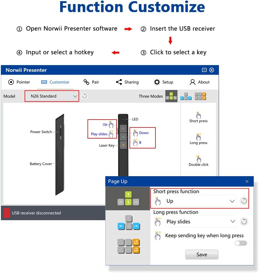 - Functions and Customization - This Wireless Presentation Clicker supports Black/Full screen, Page forward/ backward. You can reconfigure the key's function via Norwii Presnter software. You can switch the function of the Back and Next button between up&down, Pgup&Pgdn, Left/right, Scroll up/down by long pressing the two buttons for 3 seconds.