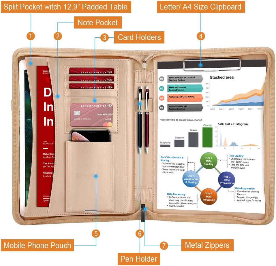 - [LARGE CAPACITY] Multiple Functions Portfolio include with a Clipboard, a Tablet Sleeve (up to 12.9-inch tablet), a Document Pocket, 5 Card Slots, a Mobile Phone Pouch with Charger Hole, and a Pencil Holder. Neat and Practical Organized All Your Stuff. This super business binder padfolio is big enough to safely store what you need yet is compact, stylish & travel-friendly.