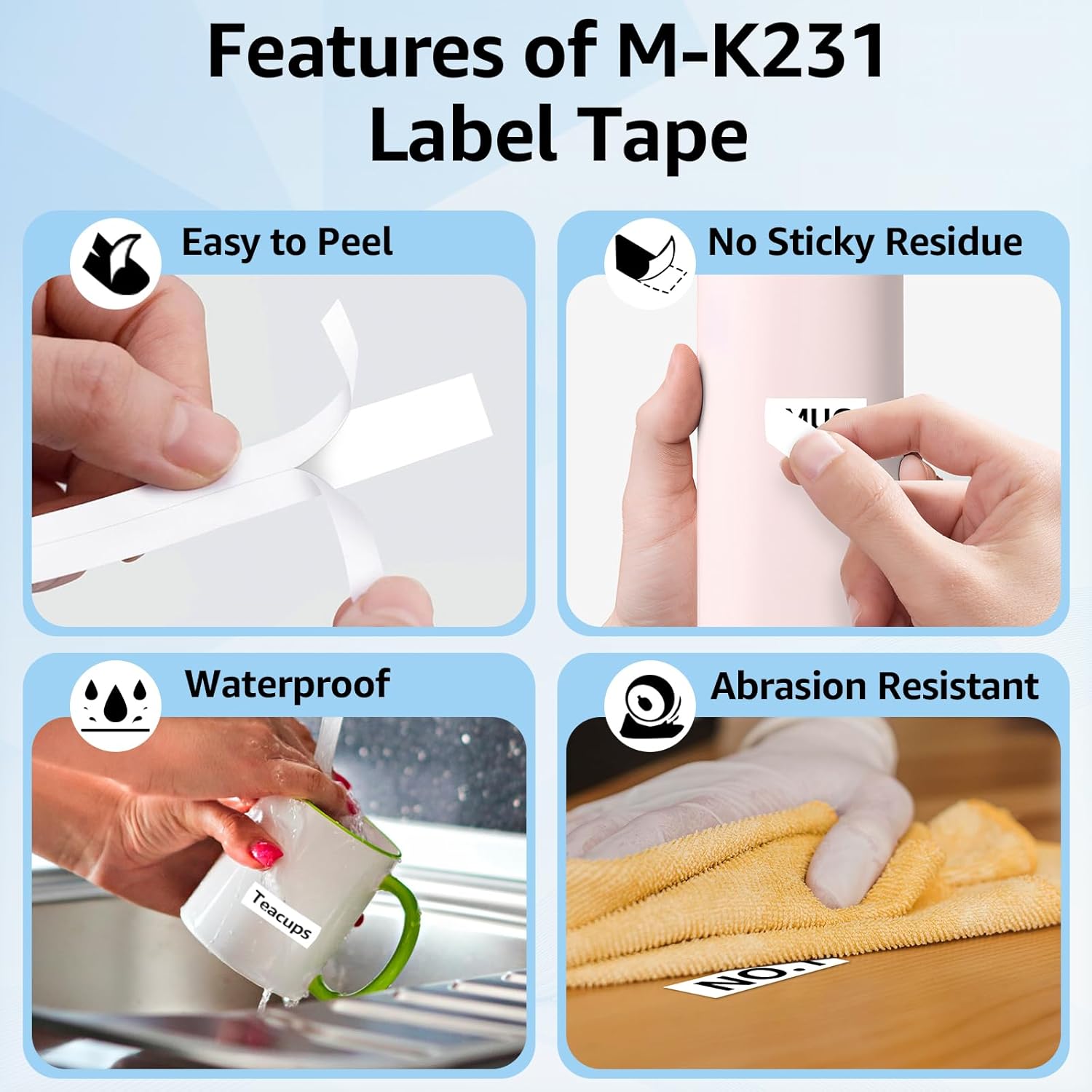 - Easy to install and use: ptouch m tape print crisp and bold text with those durable labels make identifying and labeling things easy and hassle free. The backing is split in two halves so is easy to peel and apply. Thermal labels: no ink or toner required!