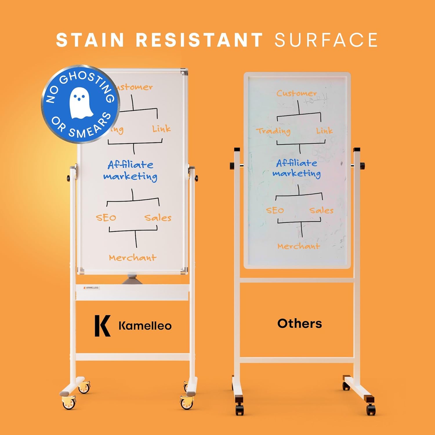 - Built to Last: Whether used in the office, classroom, or home, Kamelleo’s mobile dry-erase whiteboards are designed to hold up over years of frequent use. While other whiteboards will stain or break due to poor construction, our dry-erase whiteboards are known for their durability and reliability when you need it most!