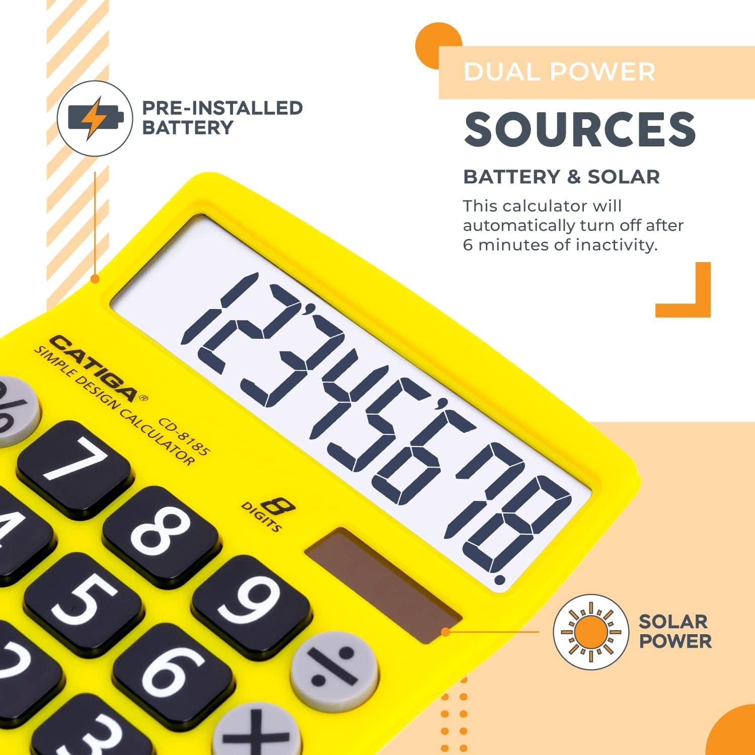 - 【DUAL POWER SOURCES】With the aid of its dual solar and battery power system, this calculator is fully powered in any lit environment. The battery comes included with the calculator, ensuring quick and easy access right away. PLEASE NOTE: The calculator will turn itself off after about 6 minutes of being idle.