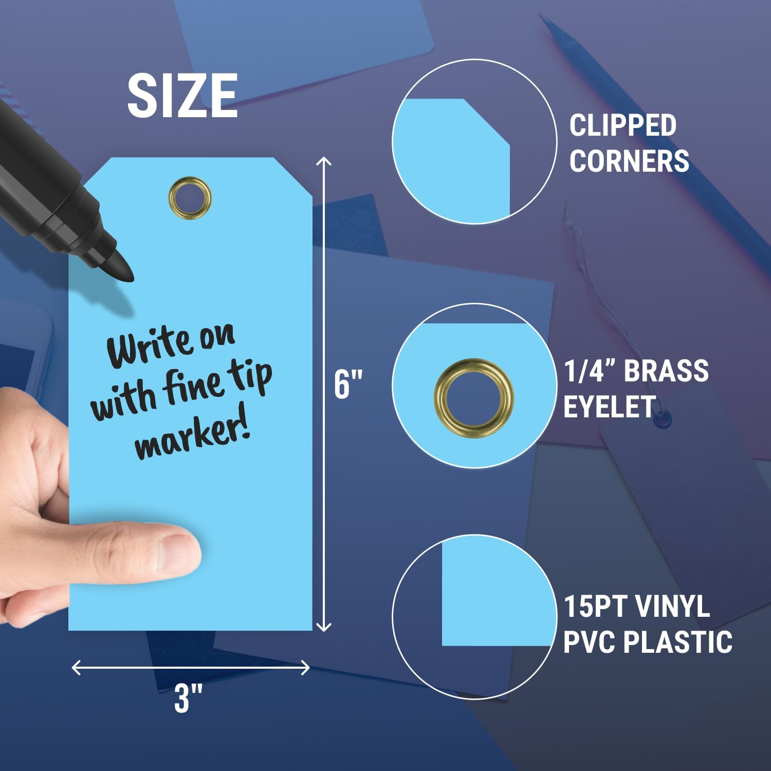 Tags 4 Less 15 Mil Waterproof Plastic Tags, Pack of 100 – 3” x 6” Heavy Duty Plastic Tags for Labeling, Outdoor Tagging, Equipment Labeling, Luggage, Valves & More (Light Blue)
