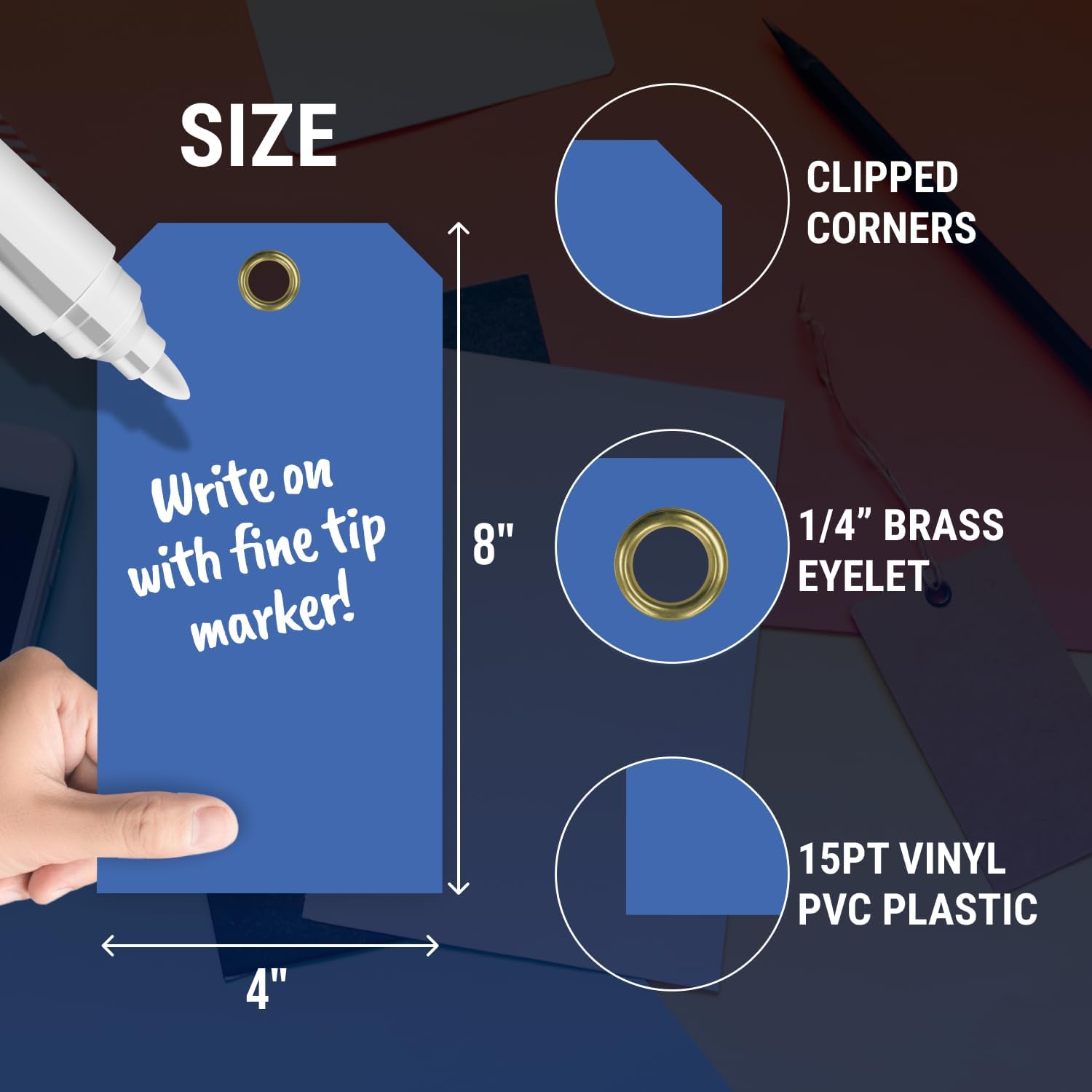 Tags 4 Less 15 Mil Waterproof Plastic Tags, Pack of 100 – 4” x 8” Heavy Duty Plastic Tags for Labeling, Outdoor Tagging, Equipment Labeling, Luggage, Valves & More (Dark Blue)