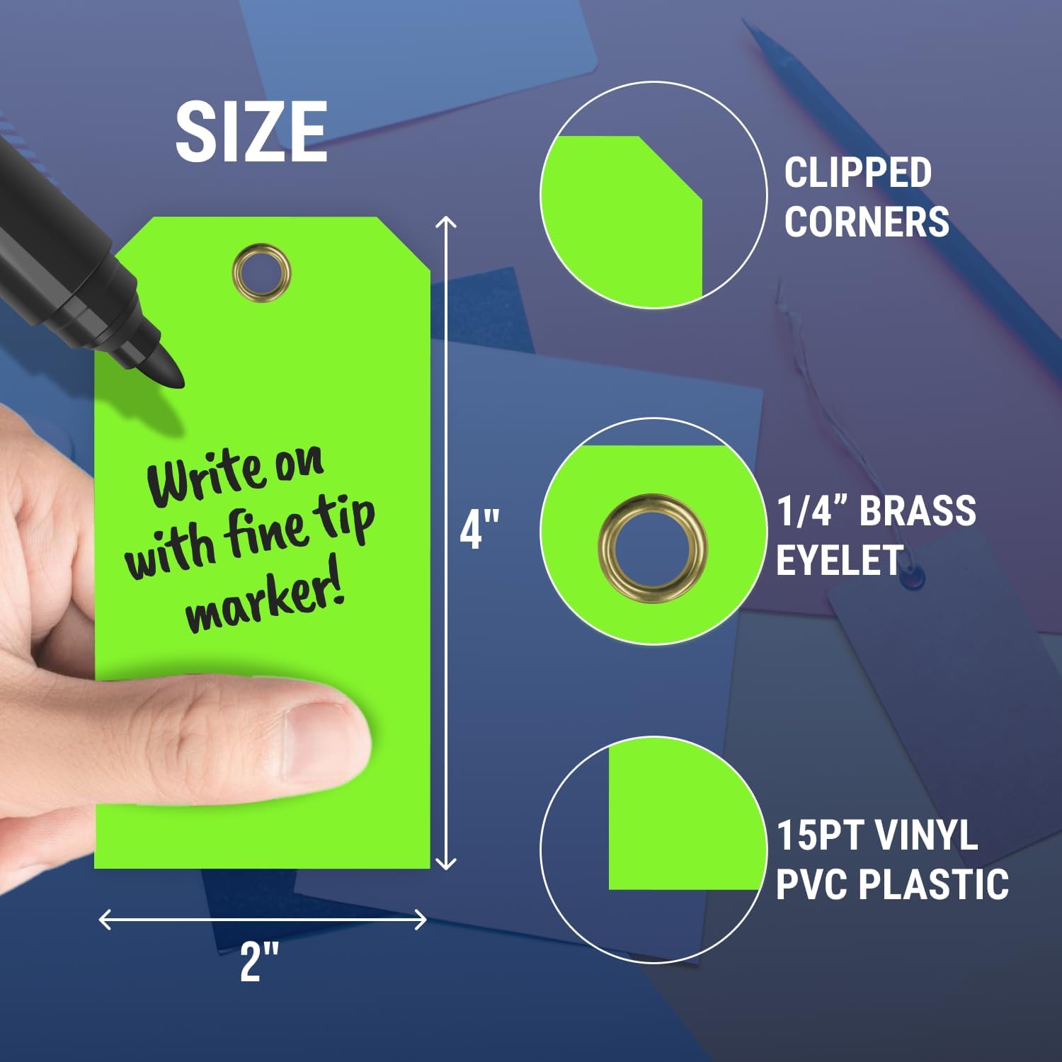 - HEAVY DUTY WATERPROOF TAGS: These vinyl tags are made with 15 pt. heavy duty vinyl that is durable, tear-proof, oil-proof, and weatherproof. This ensures that your tags will last longer than any others.
