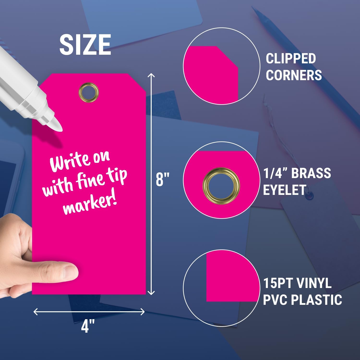 Tags 4 Less 15 Mil Waterproof Plastic Tags, Pack of 100 – 4” x 8” Heavy Duty Plastic Tags for Labeling, Outdoor Tagging, Equipment Labeling, Luggage, Valves & More (Fluorescent Pink)