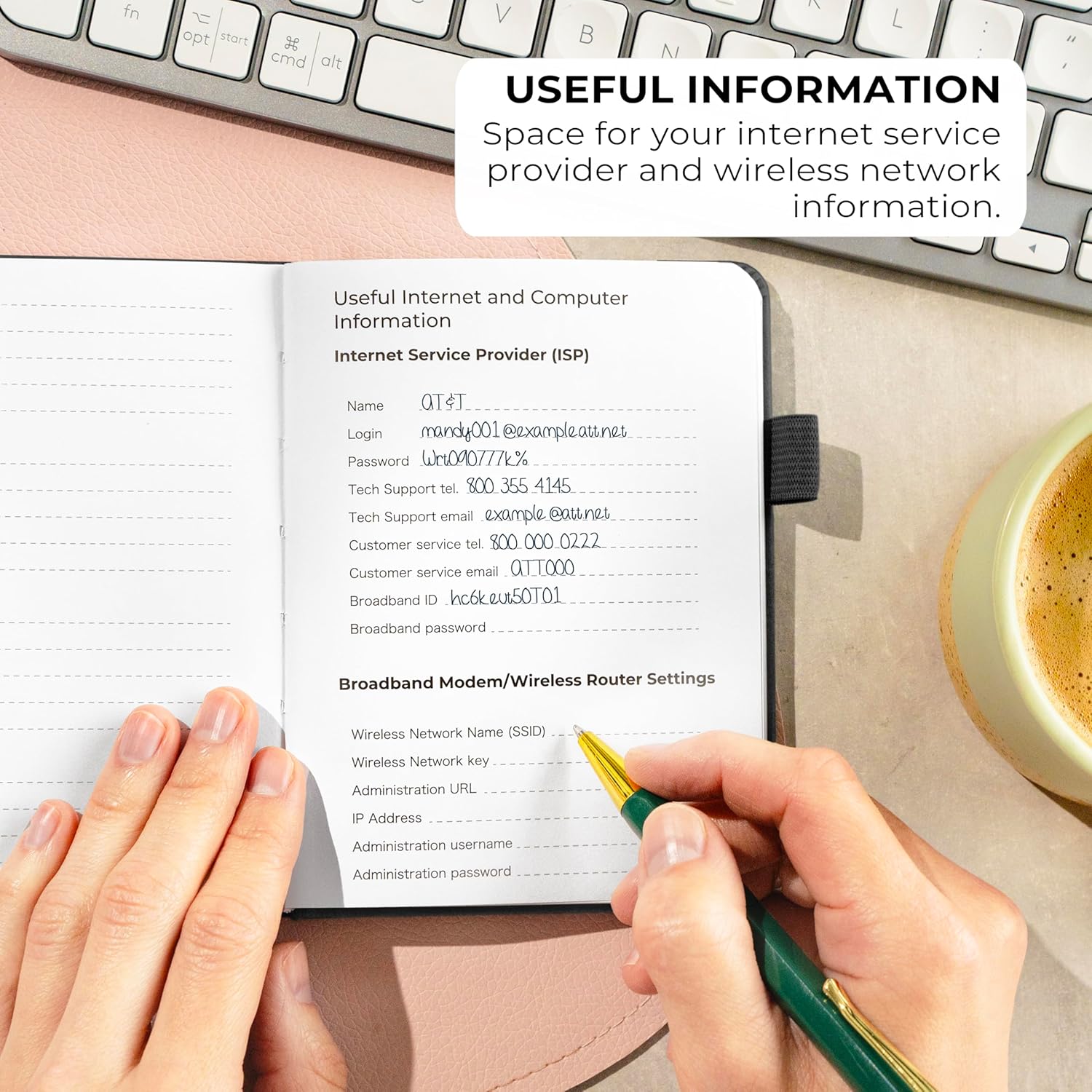 - POCKET SIZE & PREMIUM QUALITY - This internet address and password logbook with tabs comes in pocket size (4.0x5.5 inches). The password notebook has an eco-leahter hardcover, elastic band, pen loop, bookmark, pocket for notes, and thick 120gsm paper.