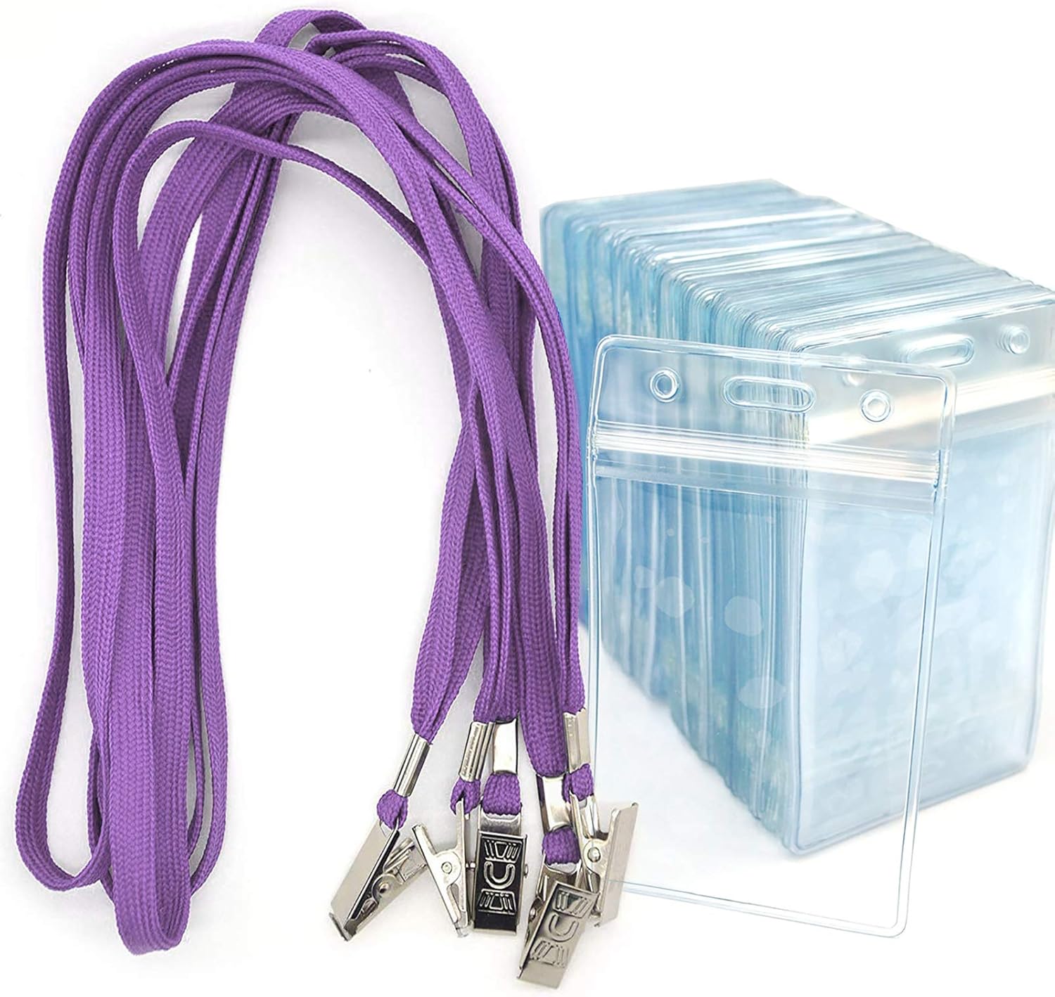 Bird Fiy Lanyards with Id Holder Badges Name Tags 50 Pack Lanyards with Bulldog Clip and 50 Pack Waterproof Clear Plastic Vertical Name Tag Badge ID Card Holders (Purple)