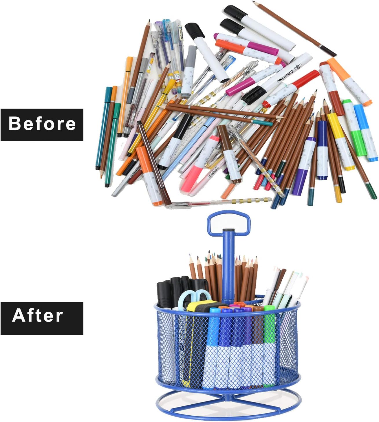 - 【Multipurpose Desktop Organizer】: This rotating storage organizer is perfect for pencils ,cosmetics, bathroom necessities, toiletries and even kitchen utensils.Try it in your craft room, playroom, laundry/utility room and even inside bathroom cabinets or under the sink; Store extra office supplies like painting pens, correction tape,scissors ,TV Remote and more; Even headphones or a charger will no longer be lying around in the future! Maximize your vertical space and keep your desk clear