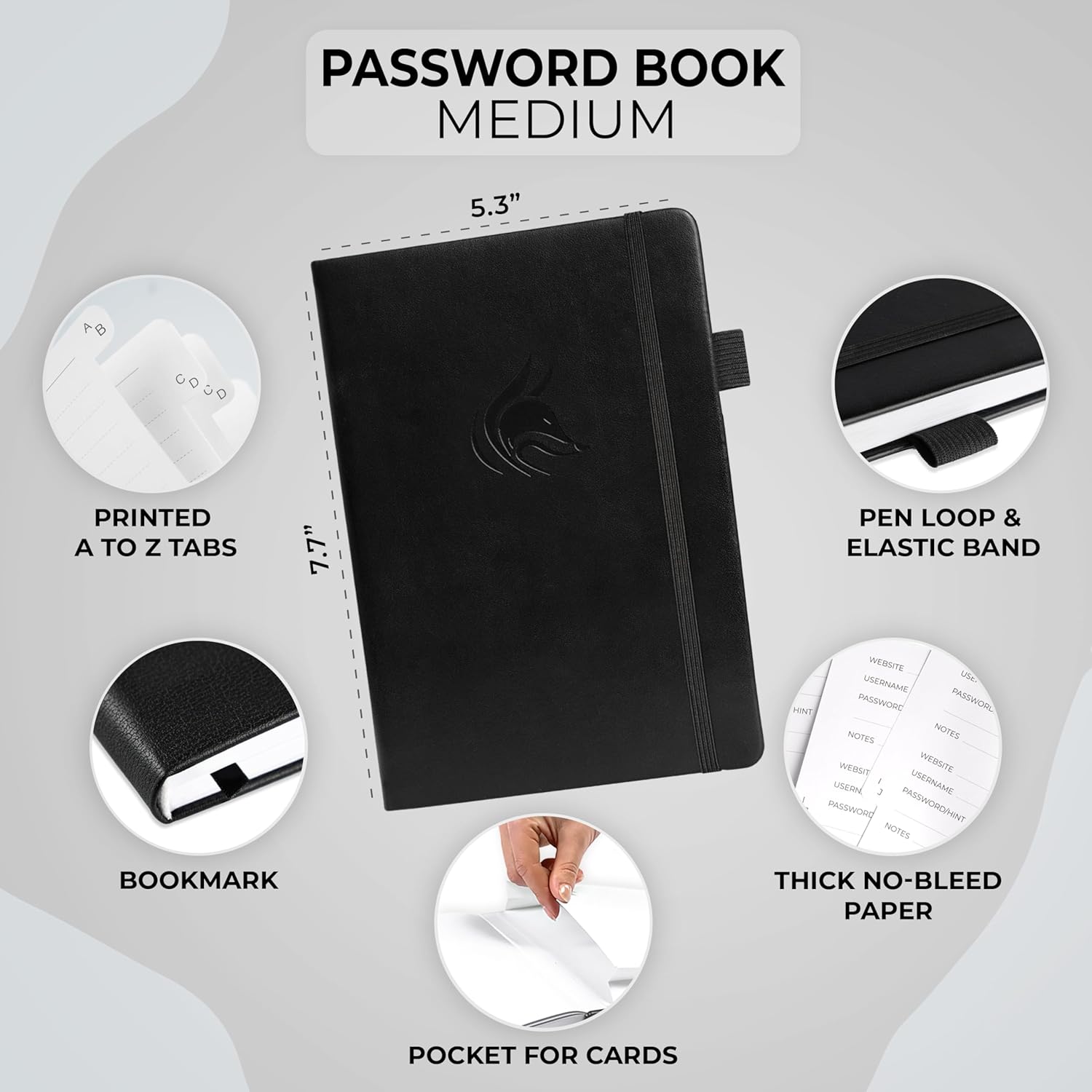 - MEDIUM SIZE & PREMIUM QUALITY - This internet address and password logbook with tabs comes in medium size (5.3x7.7 inches). The password notebook has an eco-leahter hardcover, elastic band, pen loop, bookmark, pocket for notes, and thick 120gsm paper.