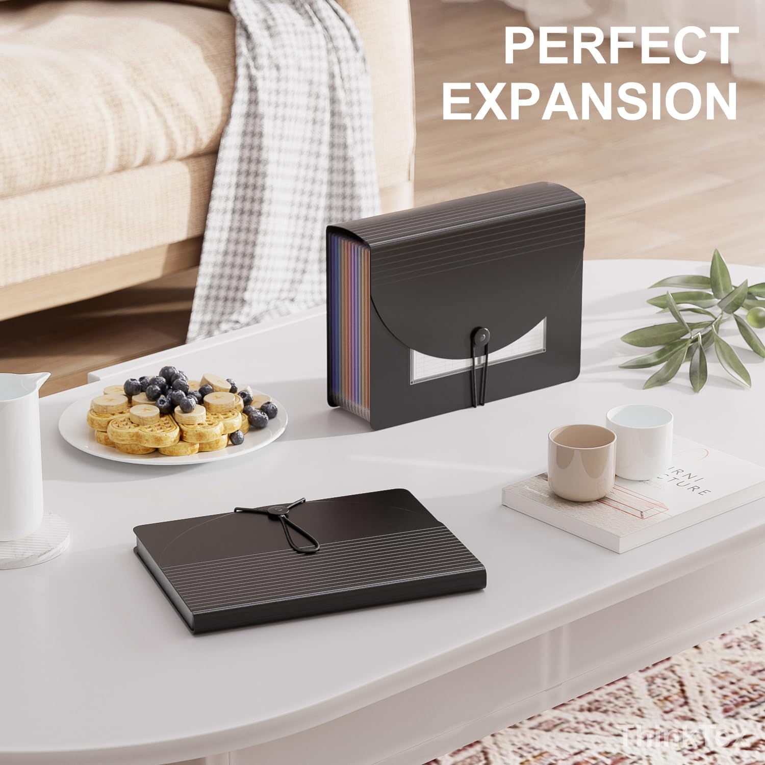 ThinkTex Accordion File Organizer, 12 - Pocket Expanding File Folders for Paper Receipts, Bills&Taxes Organizer, Letter/A4 Size Document Holder for School, Office, Home with Colorful tabs- Black