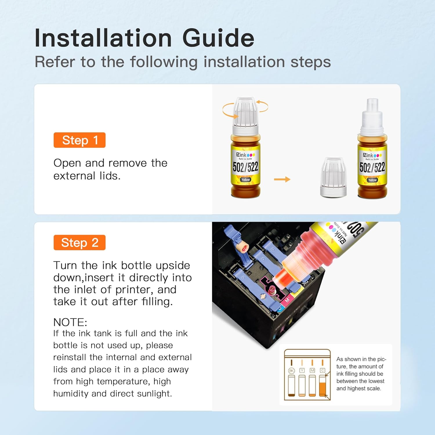 - Package Contents: 1 x Black 502 Ink Bottle, 1 x Cyan 502 Ink Bottle, 1 x Magenta 502 Ink Bottle, 1 x Yellow 502 Ink Bottle (Total 4 Pack)
