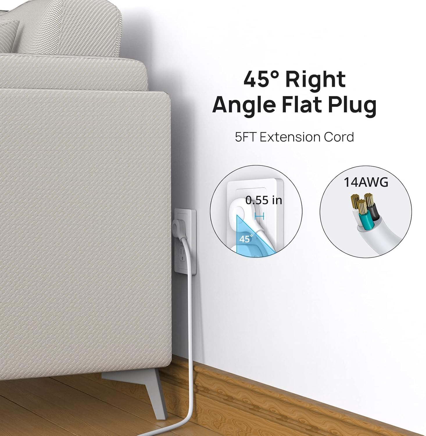- Flat Plug Power Strip: This power strip surge protector is made of 14 AWG pure copper for extra durability, the 5 Ft extension cord is heavy duty and has better current carrying capacity (15a). The low profile right angle flat plug eliminates awkward cords from cluttering and doesn’t block the bottom receptacle